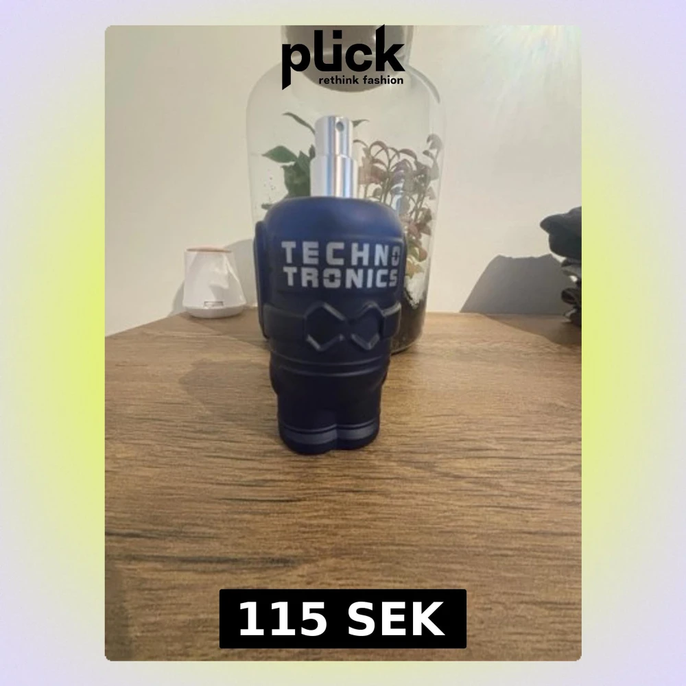 Cool parfymflaska från Technotronics i matt mörkblå plast med futuristisk design och silverfärgad spraytopp. Flaskan har ett unikt, nästan robotliknande utseende och tydlig logga framtill. Perfekt för dig som gillar modern och edgy stil.
