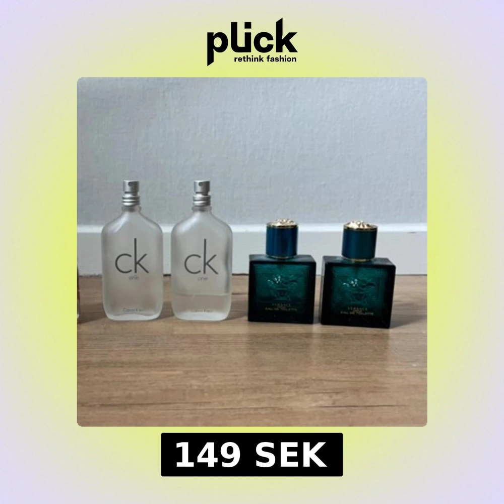 Tomma parfymflaskor. Två flaskor CK One 50ml från Calvin Klein och två flaskor Versace Eros Eau de Toilette 30ml. Passar dig som gillar stilrena och ikoniska märken.