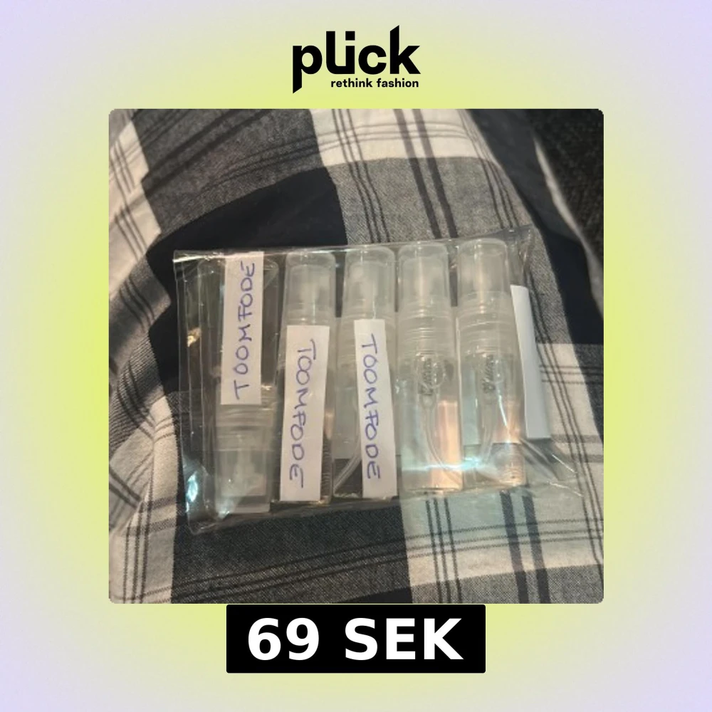 Fem praktiska parfymprover från Toomfode, perfekta att ta med i väskan eller testa nya dofter. Smidiga sprayflaskor i genomskinlig förpackning. Perfekt för dig som vill prova något nytt!