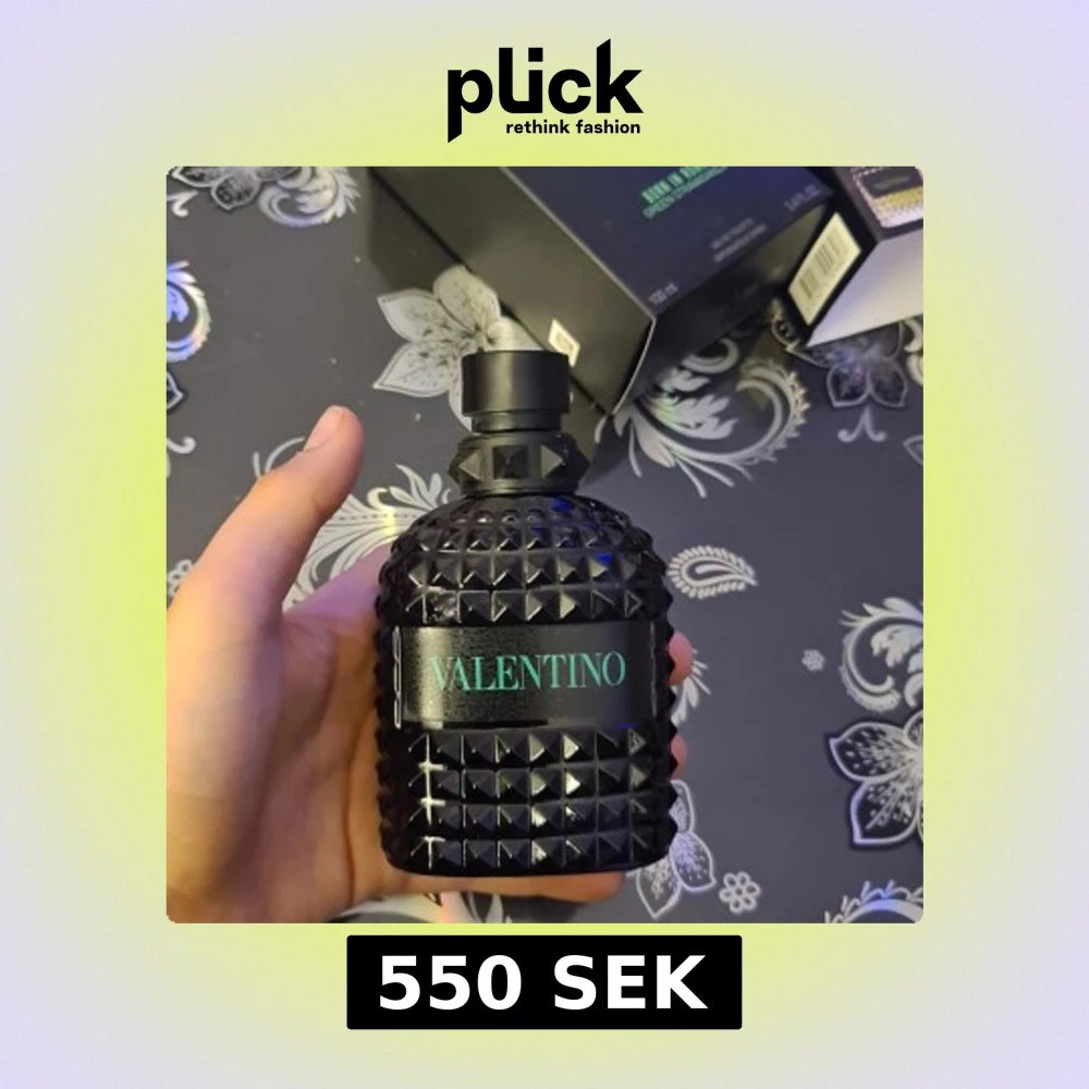 Säljer en flaska Valentino Uomo Born in Roma Green Stravaganza. Flaskan är svart med ett unikt nitat mönster och har en elegant svart kork. Parfymen kommer i en stilren förpackning med gröna detaljer. Perfekt för den som vill ha en doft med karaktär och stil. Låken är sänder men de funkar som vanlingt