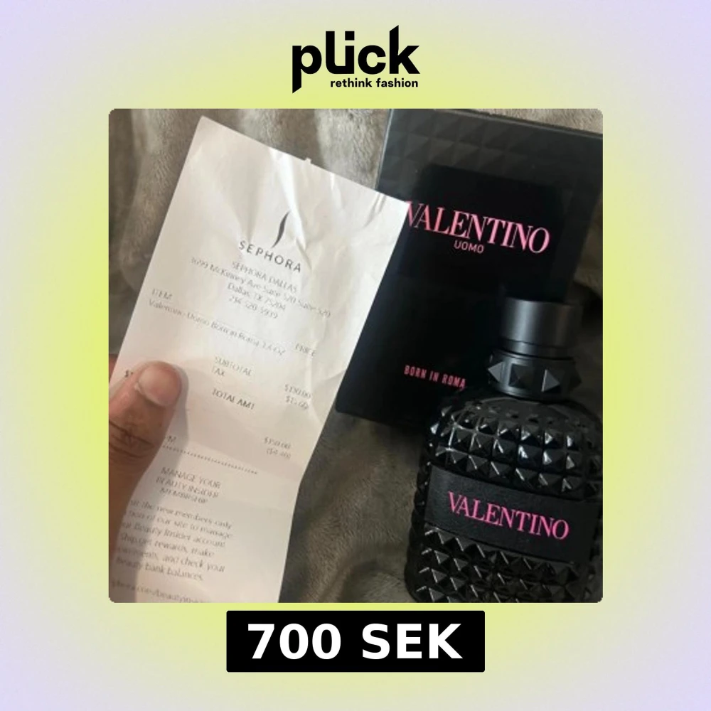 Snygg parfymflaska från Valentino Uomo Born in Roma, 100 ml. Flaskan är svart med nitar och har en cool, modern design med rosa text. Kommer i originalkartong. Perfekt för dig som gillar exklusiva och trendiga dofter.