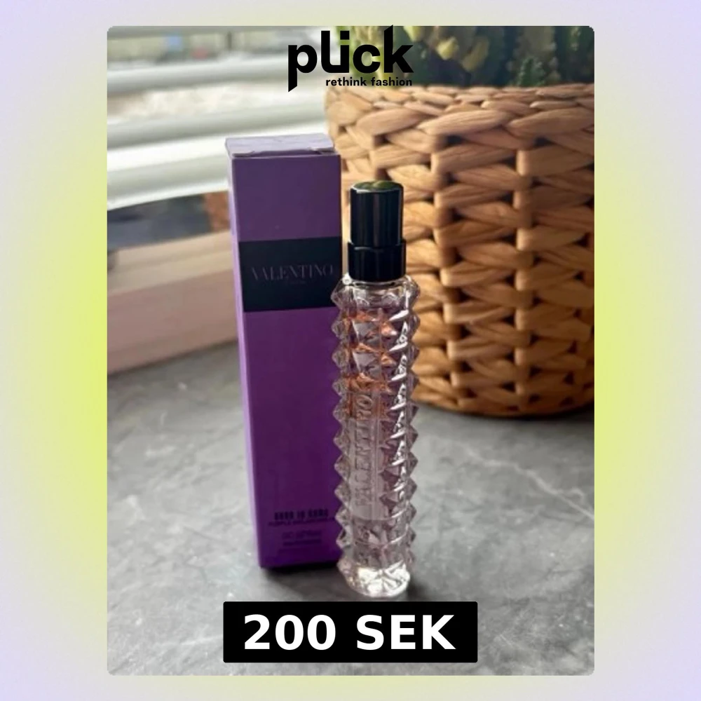 Lyxig parfym från Valentino i en transparent, mönstrad glasflaska med svart spraykork. Kommer i en snygg lila kartong med svart detalj. Doften är en Eau de Parfum och flaskan har en cool, modern design med nitar.