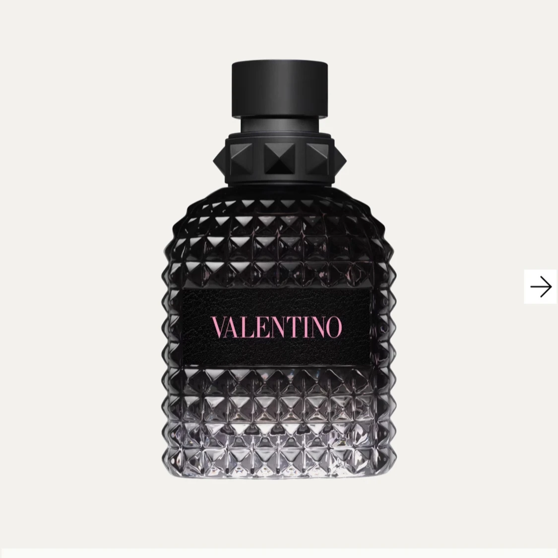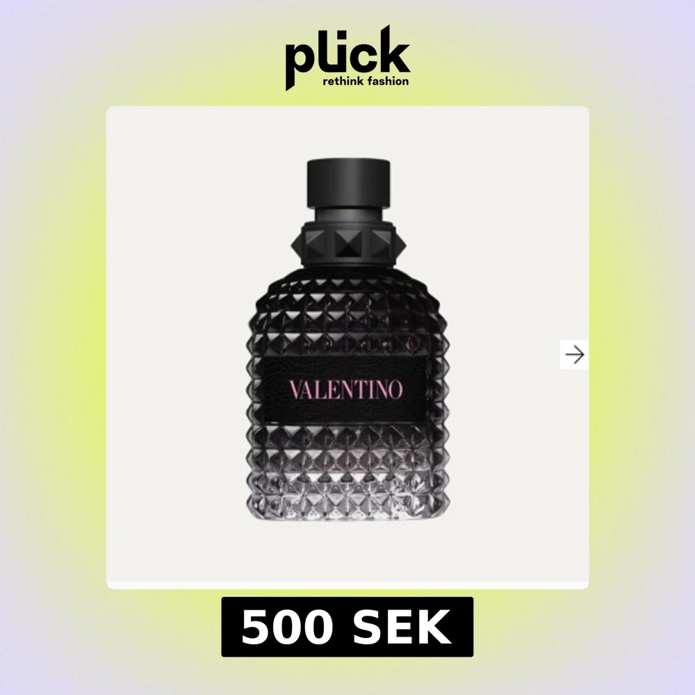 Elegant parfym från Valentino i en stilren svart flaska med nitar på korken. Flaskan har en lyxig design med ett mönster av små pyramider och en etikett med rosa text. Perfekt för den som vill ha en sofistikerad doftupplevelse.