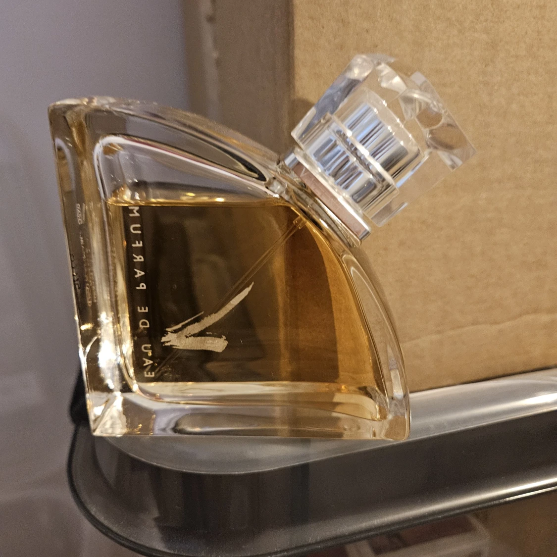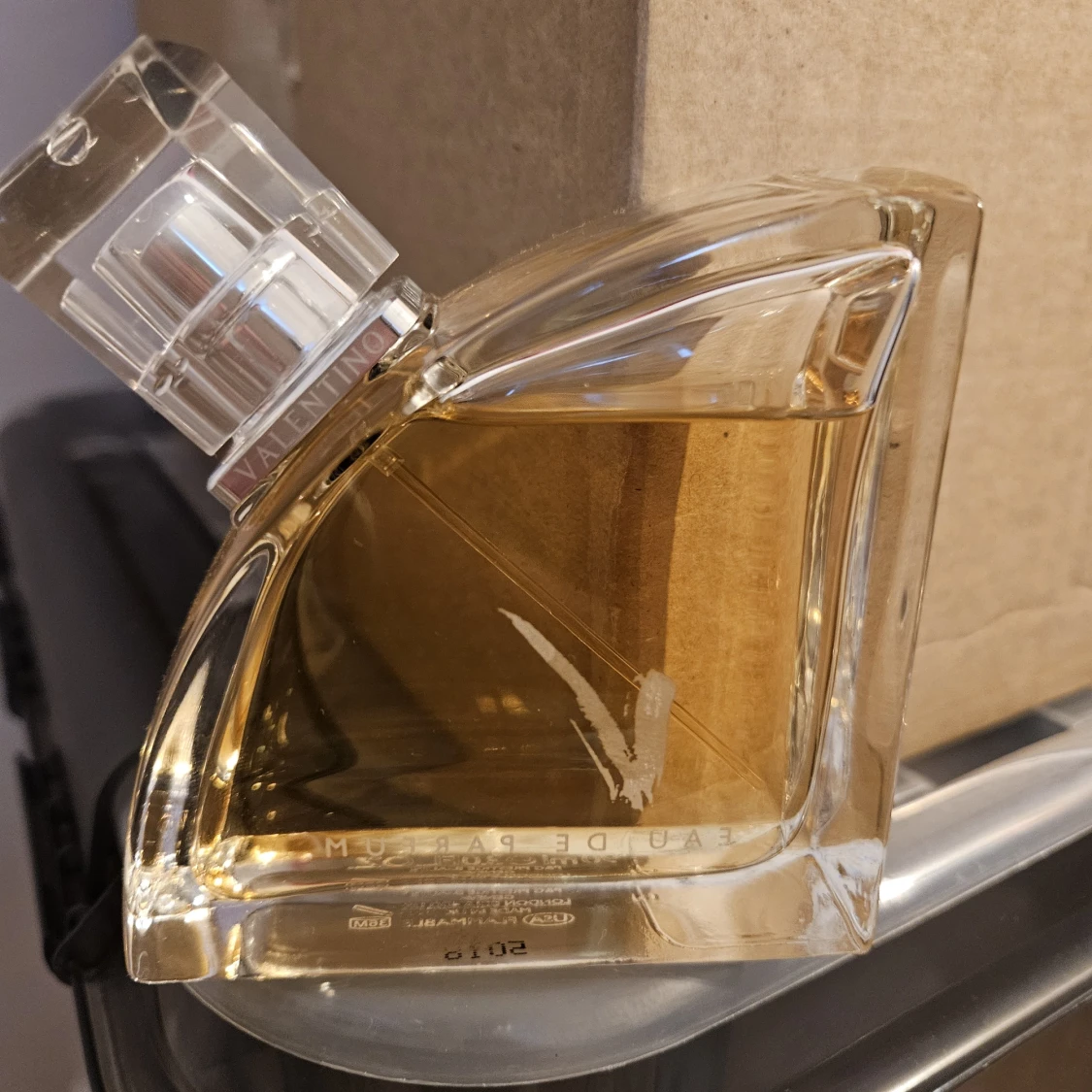 Lyxig parfym från Valentino i en unik, asymmetrisk glasflaska med transparent design och silvrig detalj på korken. Innehåller 90 ml gyllene Eau de Parfum. Flaskan har ett stilrent V-tryck på framsidan och känns riktigt exklusiv.