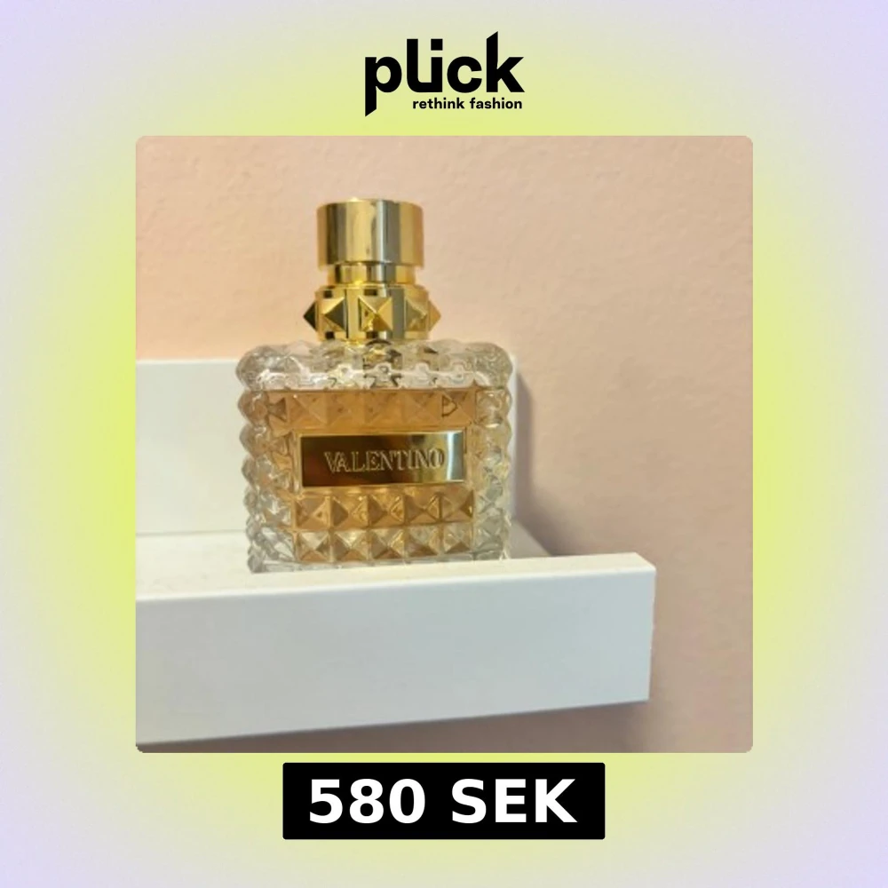 Elegant parfymflaska från Valentino med en lyxig design. Flaskan är fyrkantig och har ett mönster av små pyramider i glaset. Den har en gyllene etikett och ett matchande gyllene lock med nitar. Perfekt för den som älskar exklusiva dofter.