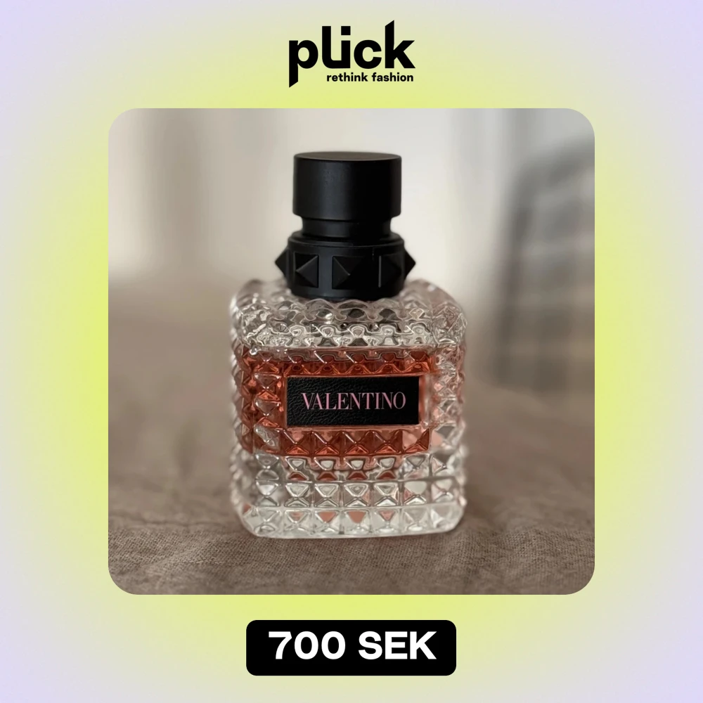 Säljer en lyxig parfymflaska från Valentino. Flaskan är fyrkantig med ett elegant mönster och har en svart kork. Den genomskinliga glasdesignen visar den rosa vätskan inuti. Perfekt för att ge en touch av glamour till din parfymkollektion!