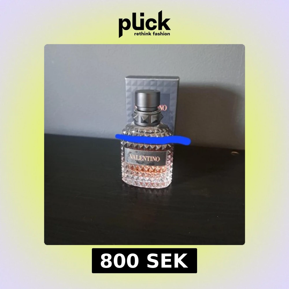Exklusiv parfym från Valentino, Uomo Born In Roma Coral Fantasy. Flaskan är 50 ml och har en lyxig, nitar-inspirerad design i genomskinligt glas med svagt rosa-orange vätska och svart mattsvart kork. Kommer med originalkartong. Använd ett fåtal gånger så det är mellan 45-50 ml kvar😁