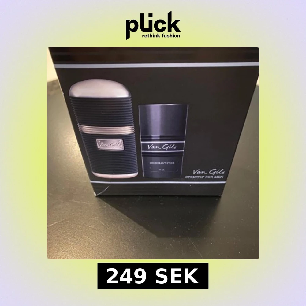 Parfymset från Van Gils med en Eau de Toilette 50 ml och en Deodorant Stick 75 ml. Båda har en stilren svart design med silverdetaljer och märke på framsidan. Flaskan har räfflad yta och metallinslag, deodoranten är slät och svart med silvertext.