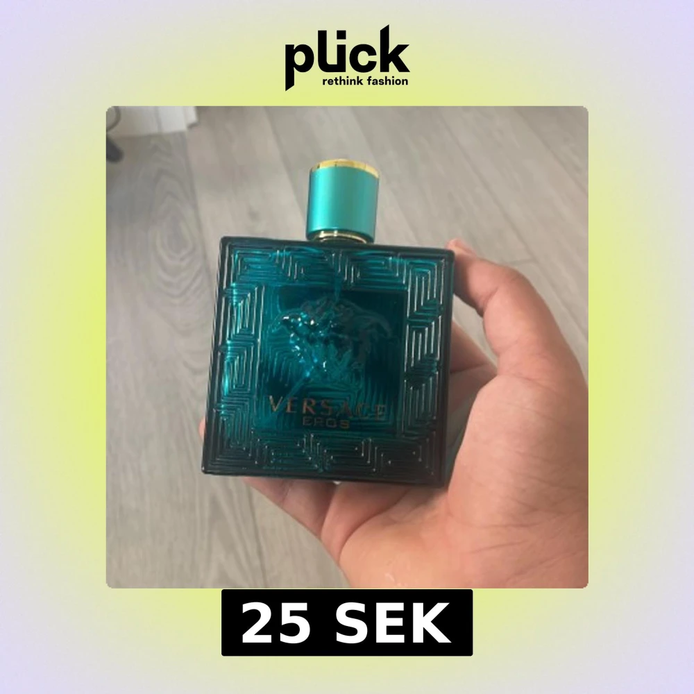 Versace Eros parfym i en stilren, turkosblå glasflaska med guldiga detaljer och Medusa-huvudet på både flaska och lock. Flaskan har en fyrkantig form med grekiskt mönster och känns riktigt lyxig och ikonisk.