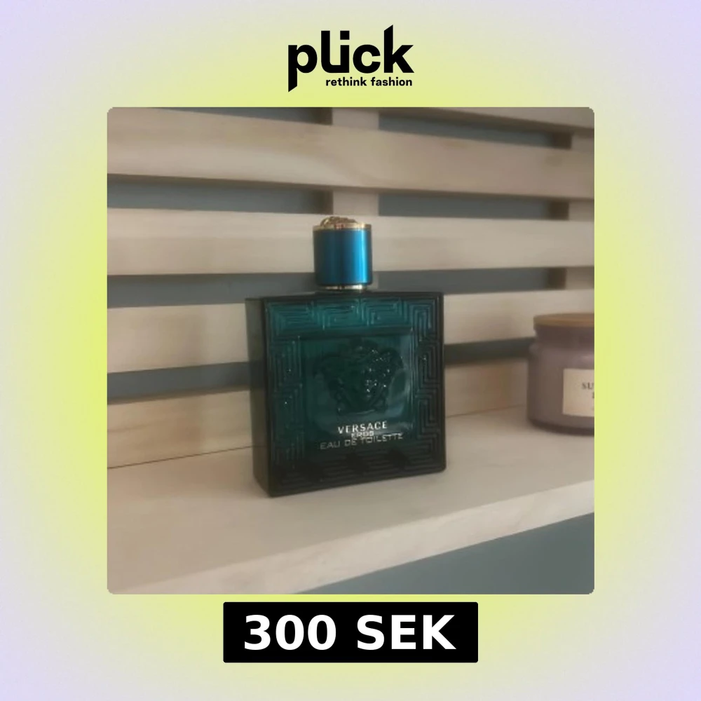 Versace Eros Eau de Toilette i en stilren, fyrkantig flaska i mörk turkos glas med Medusa-huvudet ingraverat på framsidan. Flaskan har ett blått och guldigt lock som ger en lyxig känsla. Perfekt för dig som gillar exklusiva dofter och snygg design. 100 ml men typ 85 ml kvar