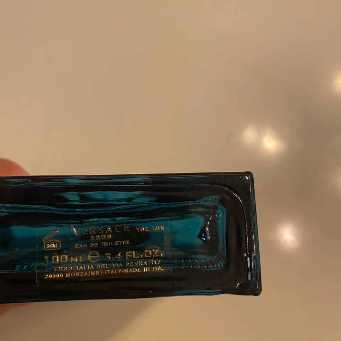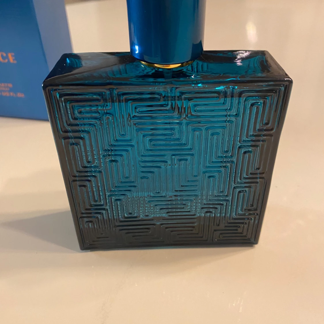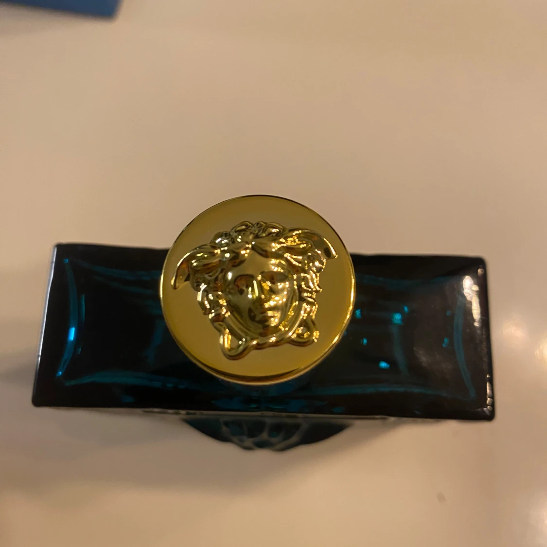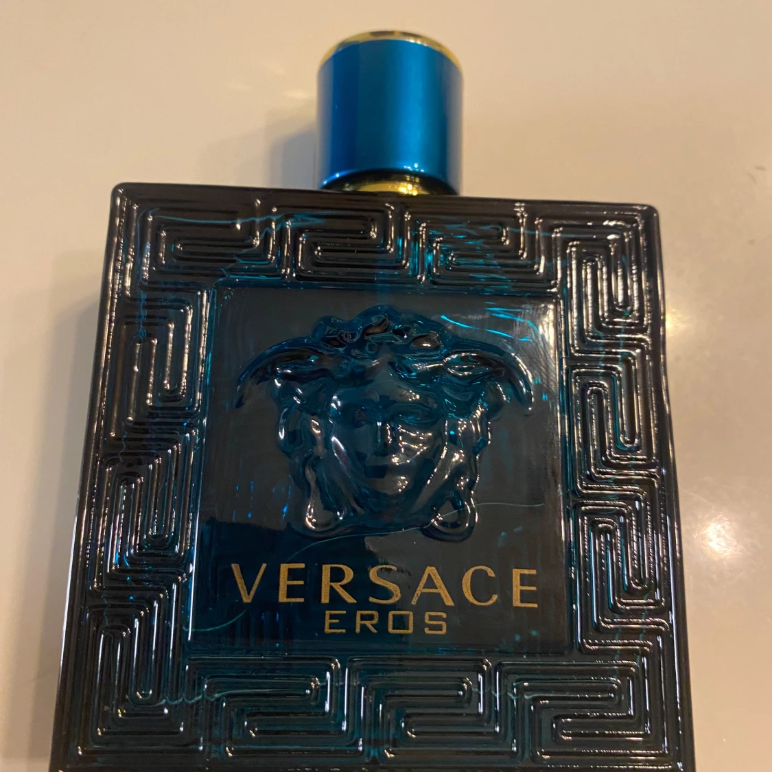 Säljer en Versace Eros Eau de Toilette i en elegant blå flaska med guldlock och Medusa-motiv. Flaskan rymmer 100 ml och har en stilren design med geometriska mönster. Perfekt för den som vill ha en doft med karaktär och stil.