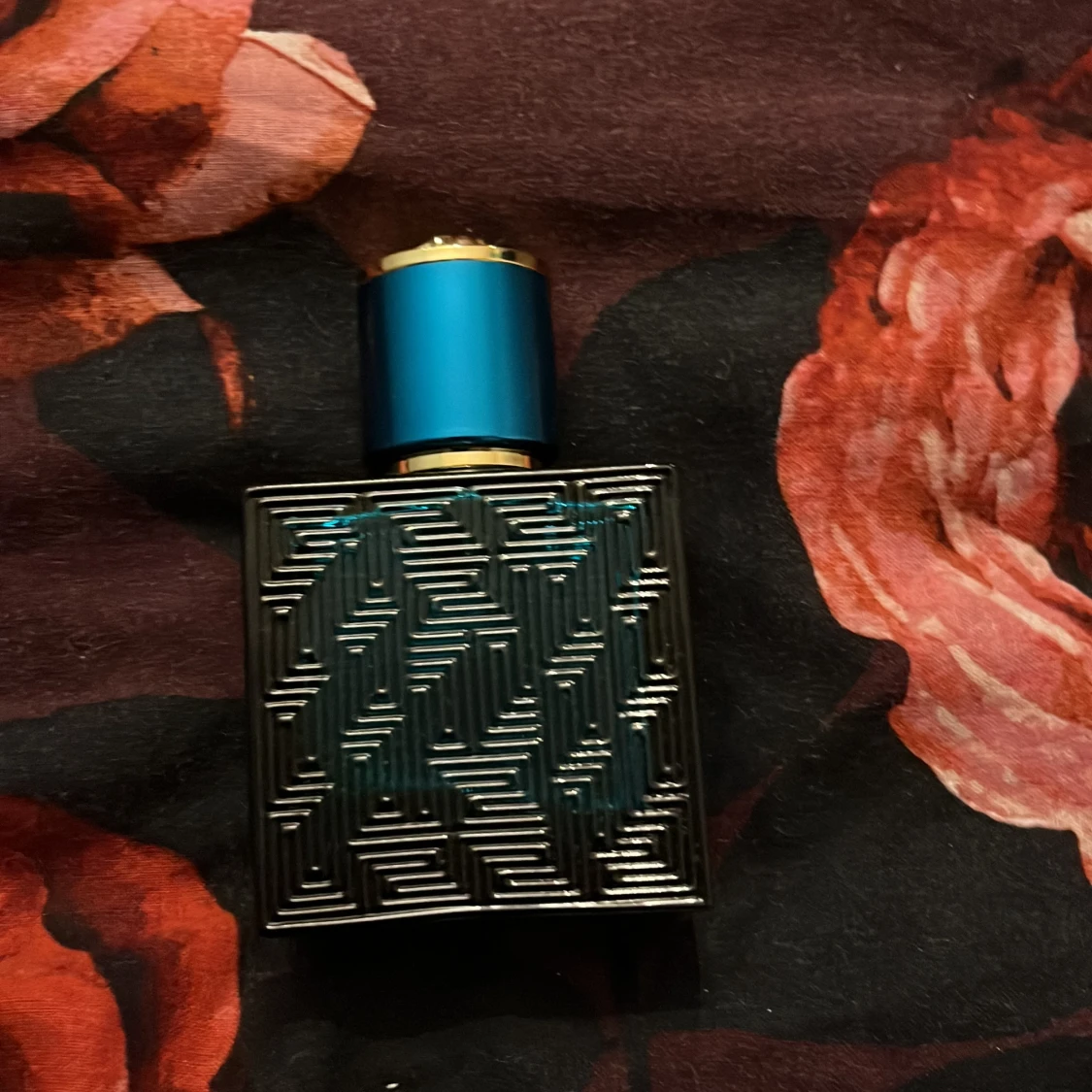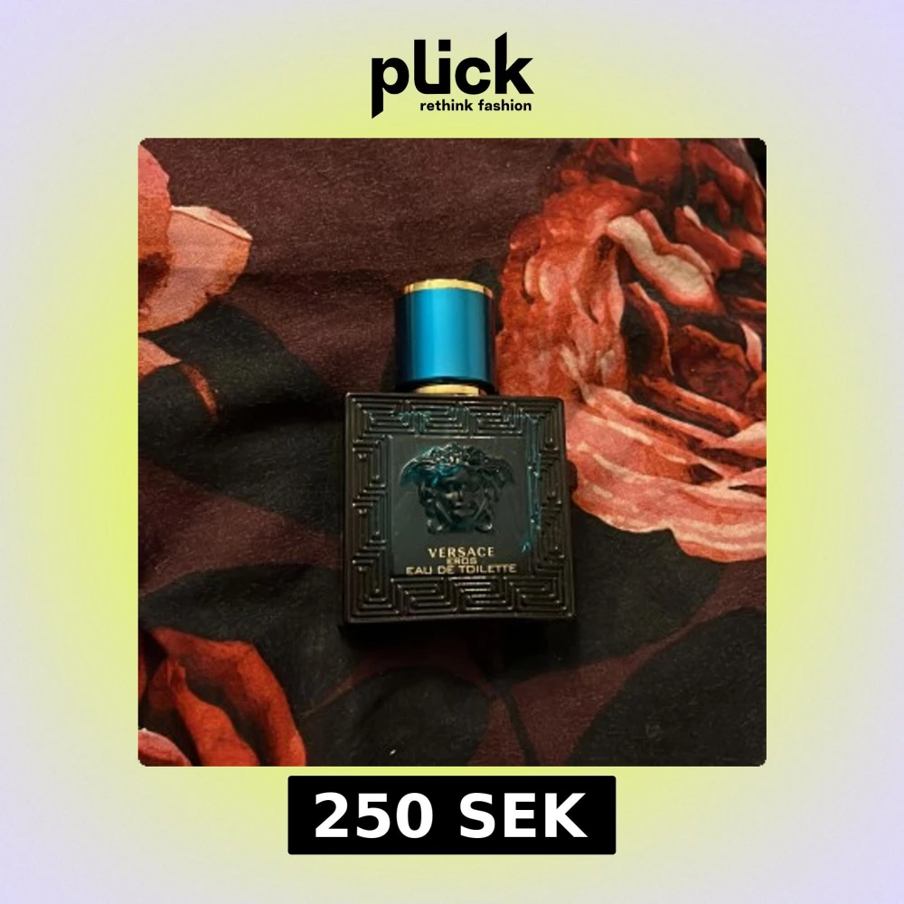 Versace Eros Eau de Toilette i en snygg, turkosblå glasflaska med guldiga detaljer och Medusa-huvudet på framsidan. Flaskan rymmer 30 ml och har en lyxig, maskulin design med geometriskt mönster.
