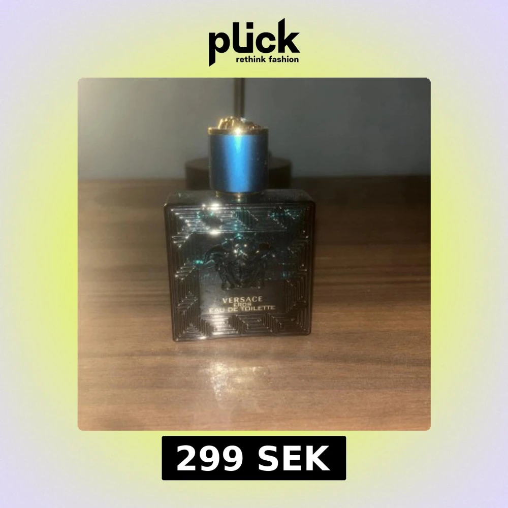 Säljer en elegant Versace Eros Eau de Toilette i en stilren mörkblå flaska med guldiga detaljer. Flaskan har en fyrkantig form och pryds av Versaces ikoniska Medusa-motiv. Perfekt för den som vill ha en doft med karaktär och stil. Runt 30ml kvar.