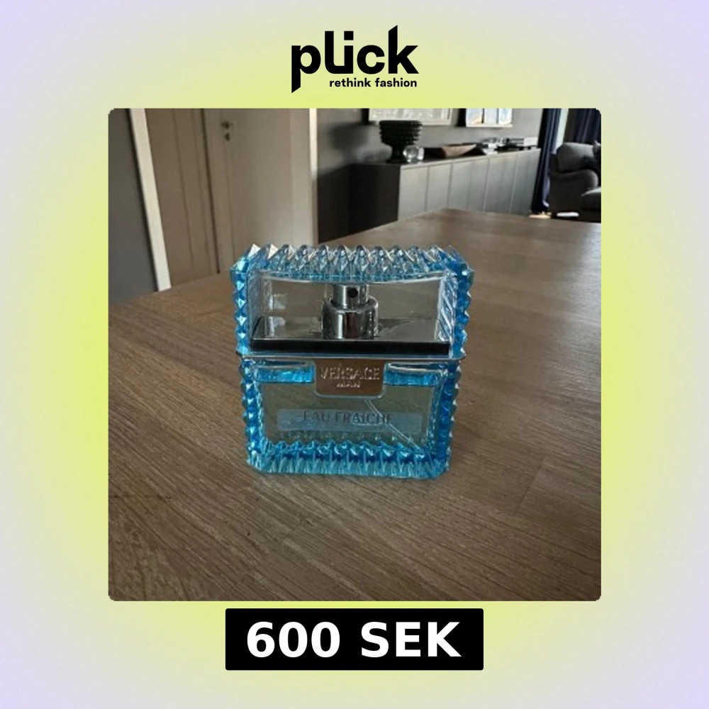 Säljer en fräsch och stilren Versace Eau Fraîche parfym i en snygg blå flaska med ett unikt mönster. Flaskan har en rektangulär form med en silverfärgad spraypump. Perfekt för den som vill ha en doft som sticker ut.