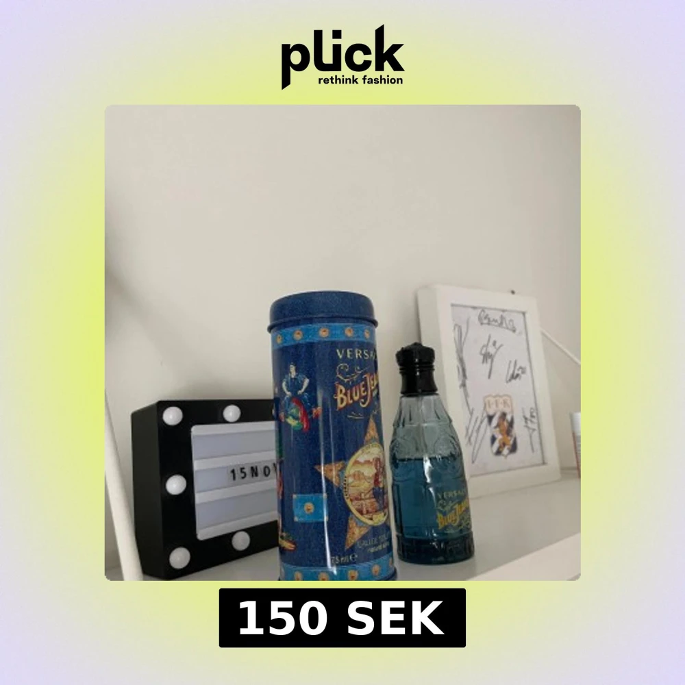 Säljer en flaska Versace Blue Jeans Eau de Toilette för män. Flaskan har en unik design med blått glas och svart kork. Parfymen kommer i en dekorativ blå metallburk med färgglada detaljer och en volym på 75 ml.