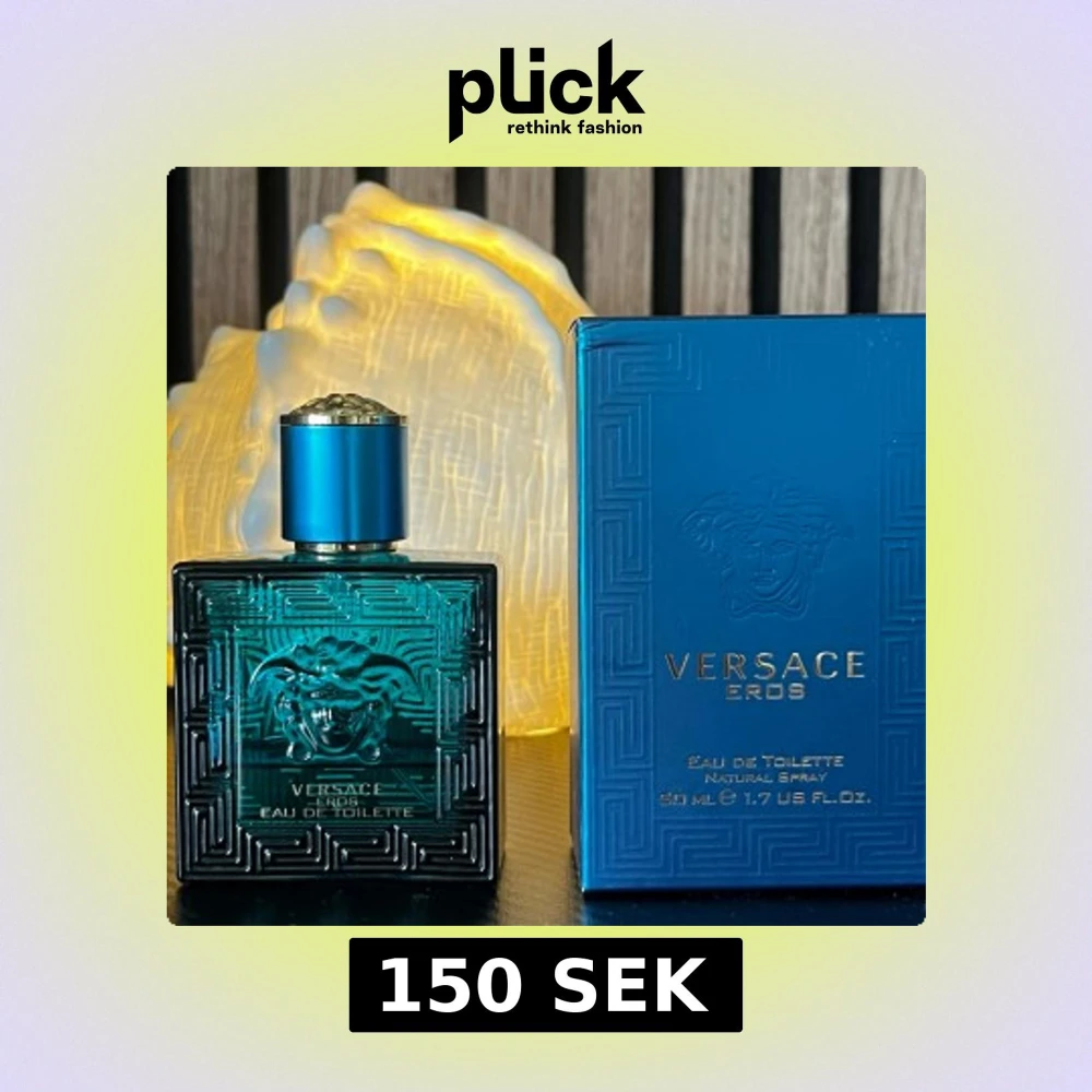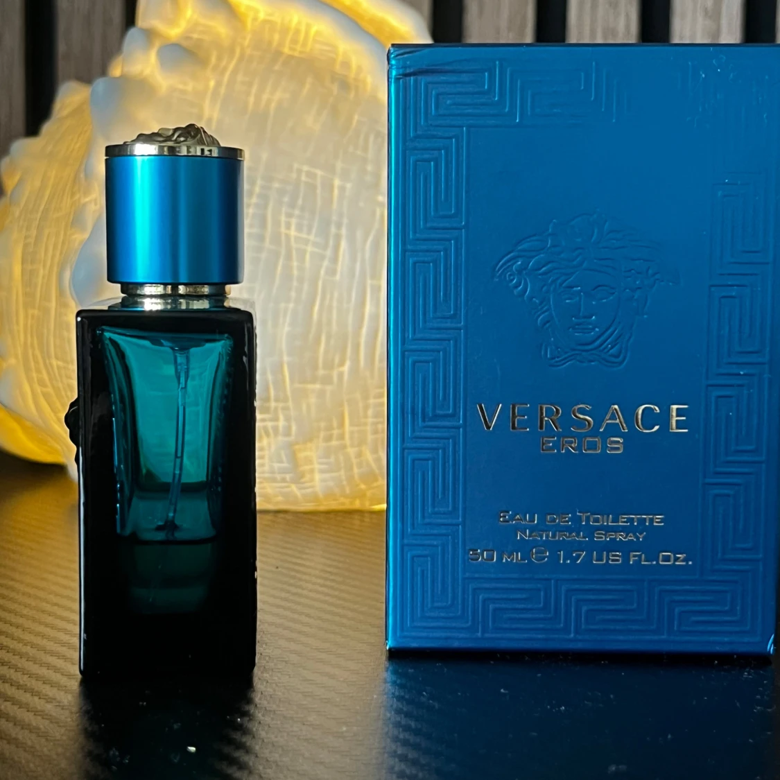 15/50 Ml kvar Versace Eros Eau de Toilette i en snygg turkosblå glasflaska med Medusa-detalj och geometriskt mönster. Flaskan har en metallisk blå kork med gulddetaljer. Kommer i matchande blå kartong med guldtext. Volym: 50 ml.