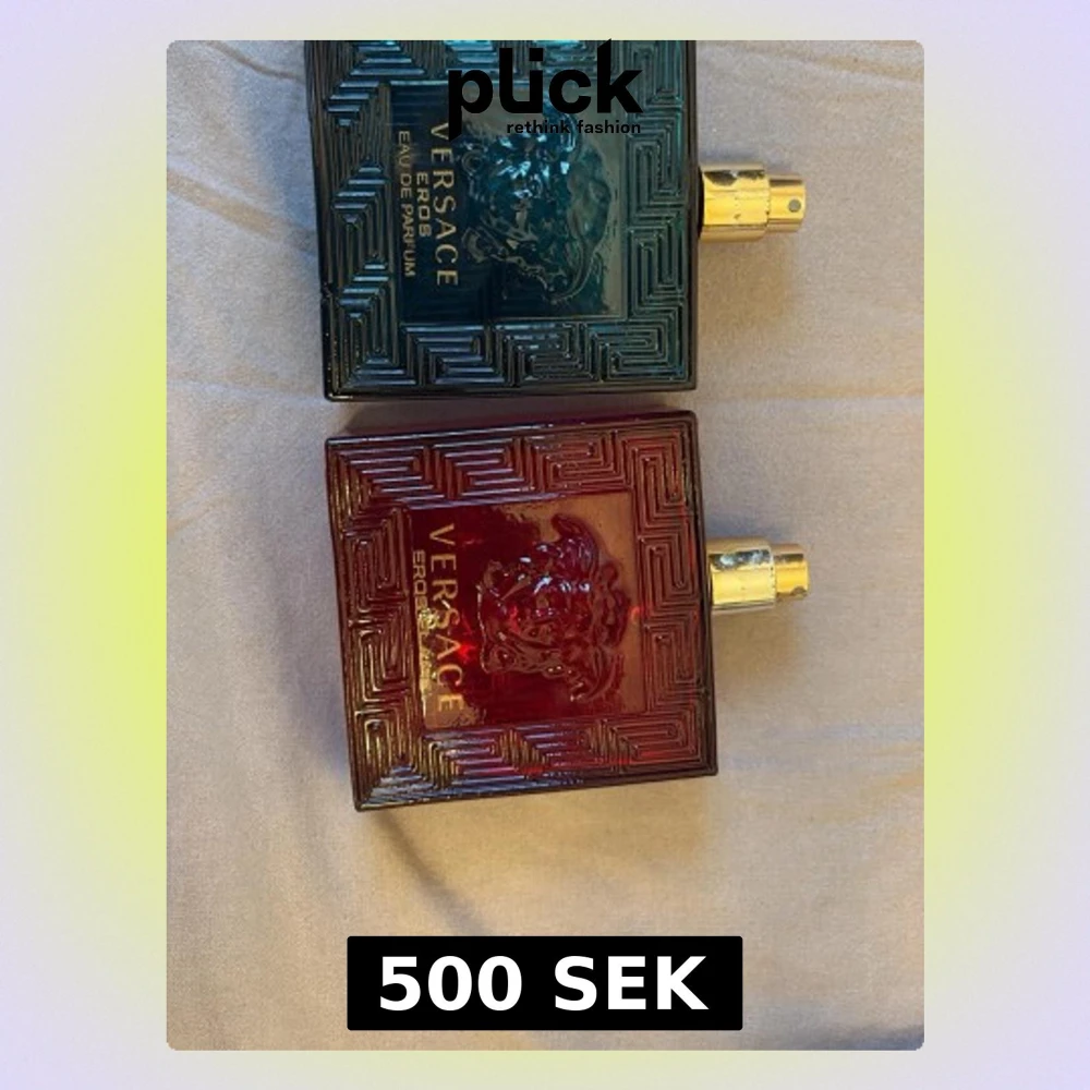 Två flaskor Versace Eros Eau de Parfum i snygga färger. Perfekt för dig som vill ha en ikonisk doft med lyxig känsla. Flaskorna har den klassiska Versace-designen med Medusa-huvudet. Volym och ingredienser syns ej på bilden.