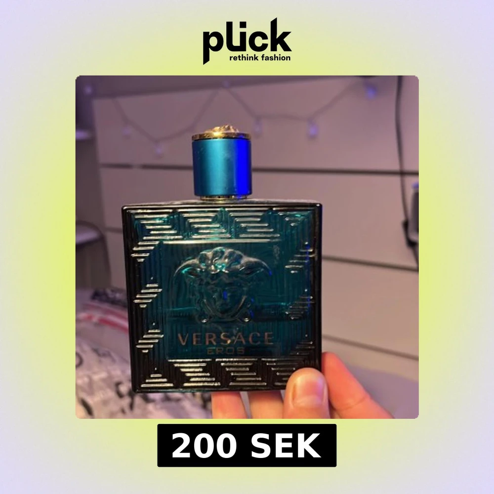 Versace Eros herrparfym i en stilren, fyrkantig flaska i turkost glas med guldblått lock och Medusa-detalj. Flaskan har tydliga Versace-mönster och logga framtill. En ikonisk doft för dig som gillar lyxiga och fräscha parfymer den har ungefär 40ml kvar i flaskan