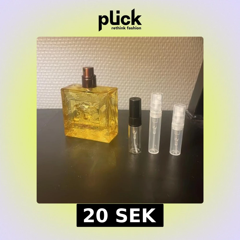Snygg Versace parfymflaska i gult glas, säljs tillsammans med tre praktiska provflaskor. Perfekt för dig som vill testa eller ta med doften på språng. Märket är tydligt på flaskan, vilket ger en lyxig känsla.