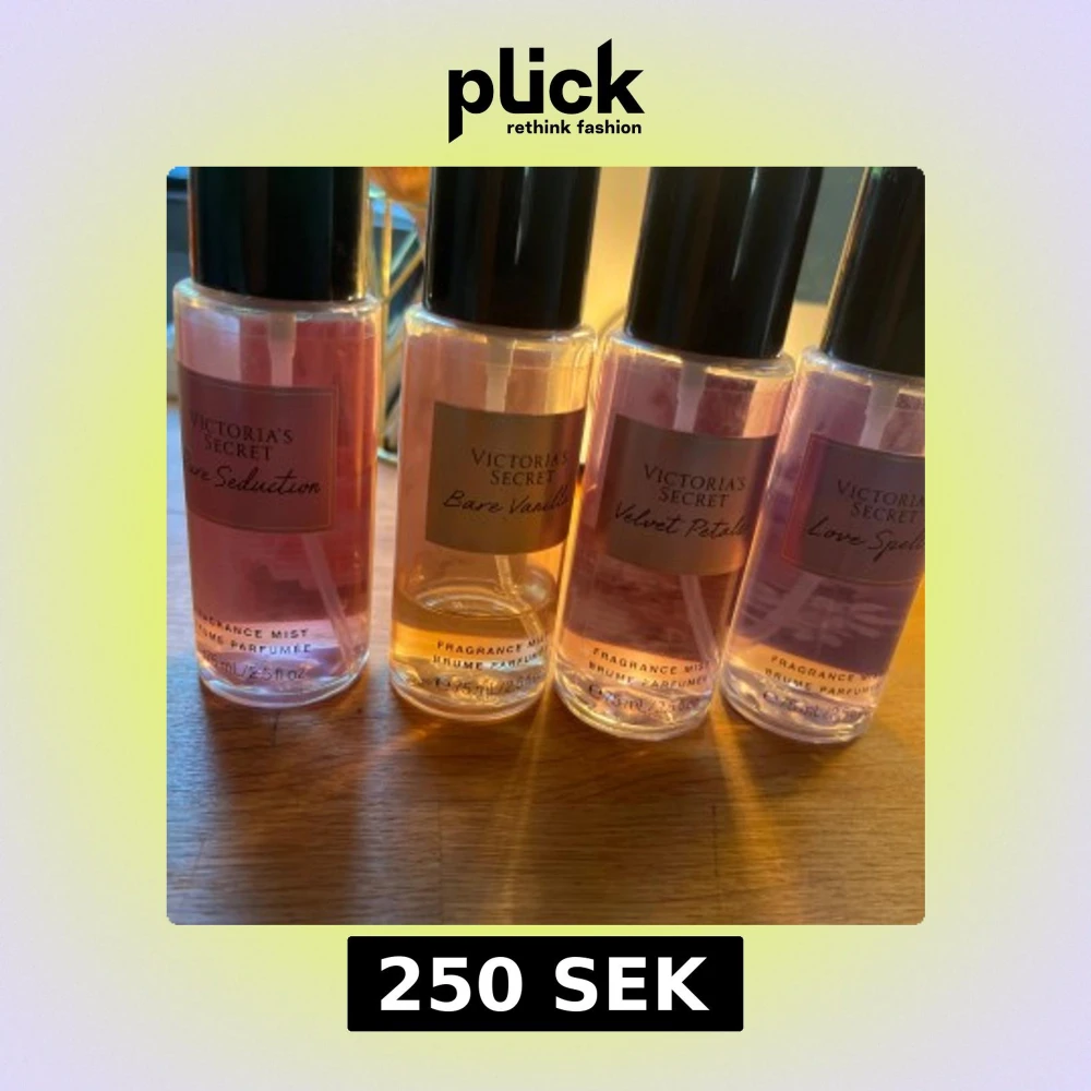 Fyra olika Victoria's Secret body mists: Pure Seduction (rosa), Bare Vanilla (ljusgul), Velvet Petals (ljusrosa) och Love Spell (lila). Alla i genomskinliga plastflaskor med svarta lock, 75 ml vardera. Perfekt för dig som vill testa flera dofter från ett ikoniskt märke. Alla förutom bare vanilla har mer en hälften kvar, nypris 450 kr! PRISET KAN DISKUTERAS SÅKLART