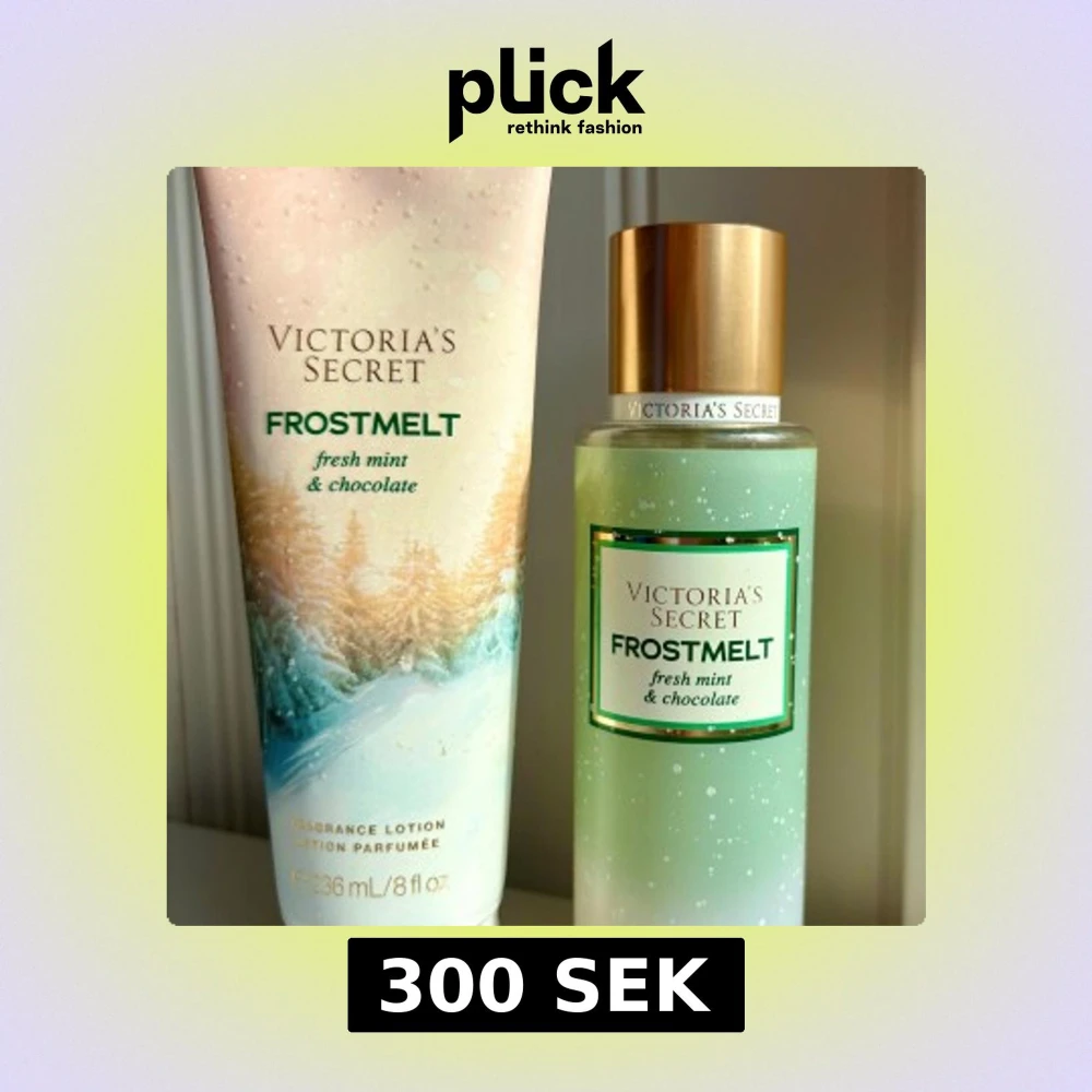 Victoria's Secret Frostmelt Limited Edition bjuder på en unik mix av fräsch mint och varm choklad. En helt fantastisk gourmanddoft, perfekt för helgerna som kommer. Bodymist 250 ml, Body Lotion 236 ml. Misten är enbart testad ett fåtal gånger, vilket syns på bild. Lotion oöppnad, vilket syns på bild. Givetvis förvarad mörkt och svalt.