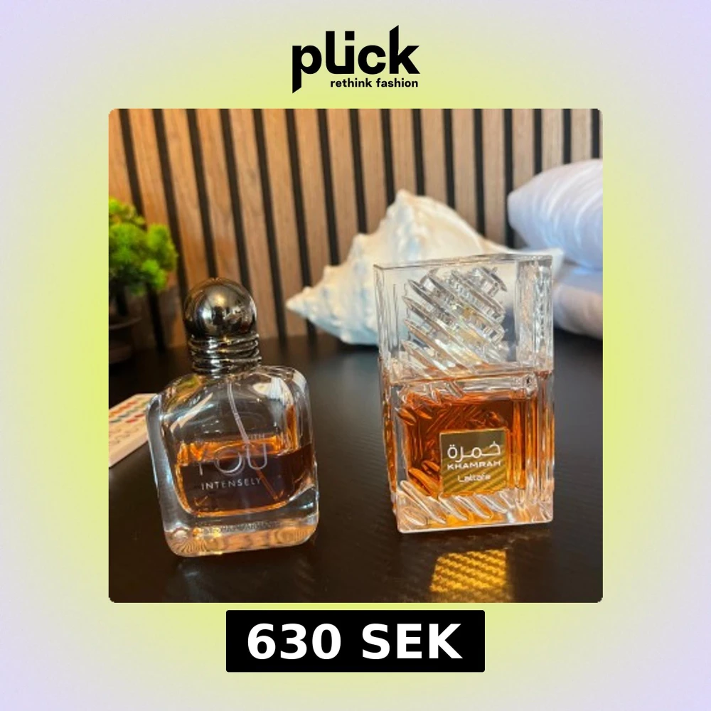 Parfym bundle perfekt för den kommande vintern en swy intensely 25/100och en Lattafa khamrah 95/100 Ml jag har box tilll Lattafa men inte till swy för jag råkade trampa sönder den… men ja två mysiga dofter Två exklusiva parfymer: 'Emporio Armani In Love With You Intensely' i en rundad glasflaska med metallkork och 'Lattafa Khamrah' i en lyxigt mönstrad, fyrkantig glasflaska med guldetikett. Båda har en djup bärnstensfärgad vätska som ger en elegant vibe.
