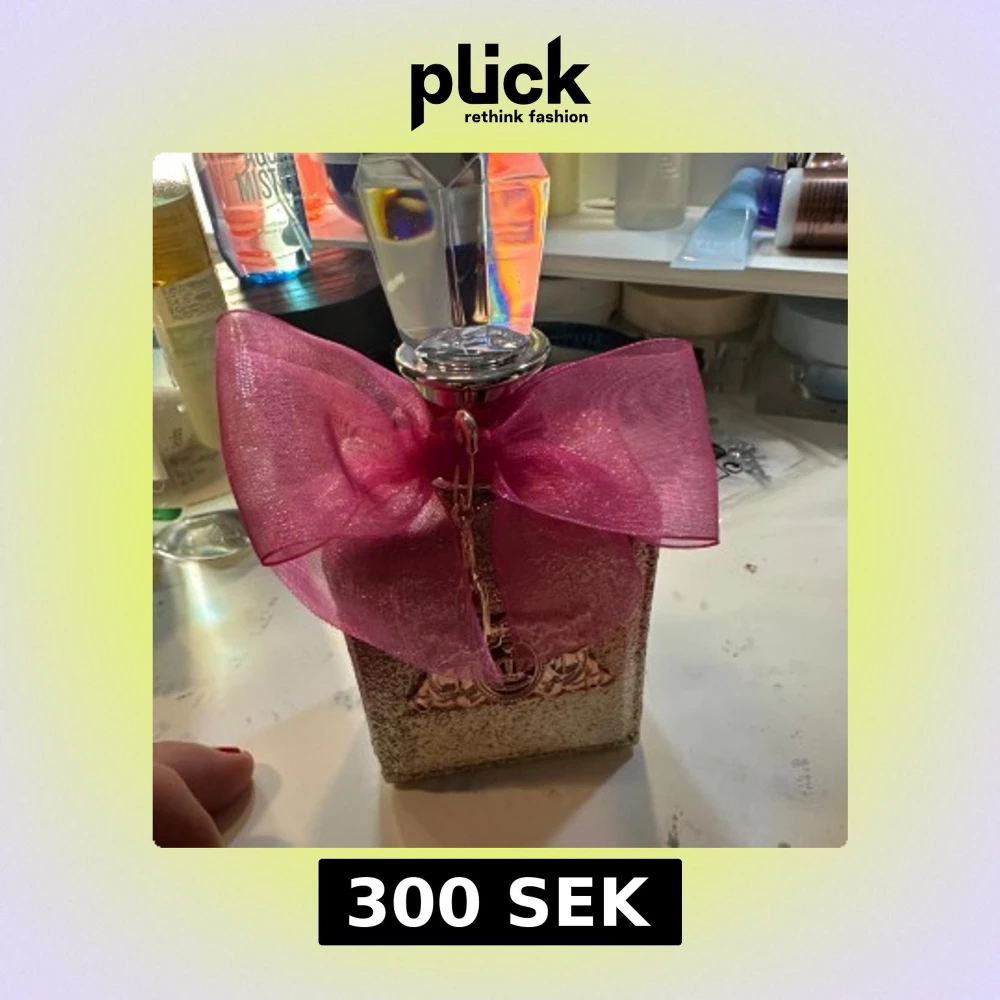 Viva La Juicy Rosé Eau de Parfum, 100 ml. Flaskan har en glittrig design med rosa rosett och Juicy Couture-emblem. Tillverkad i USA. Perfekt för dig som gillar glam och vill sticka ut. I stort sett hela flaskan kvar , inte mycket taget så jättebevarad .