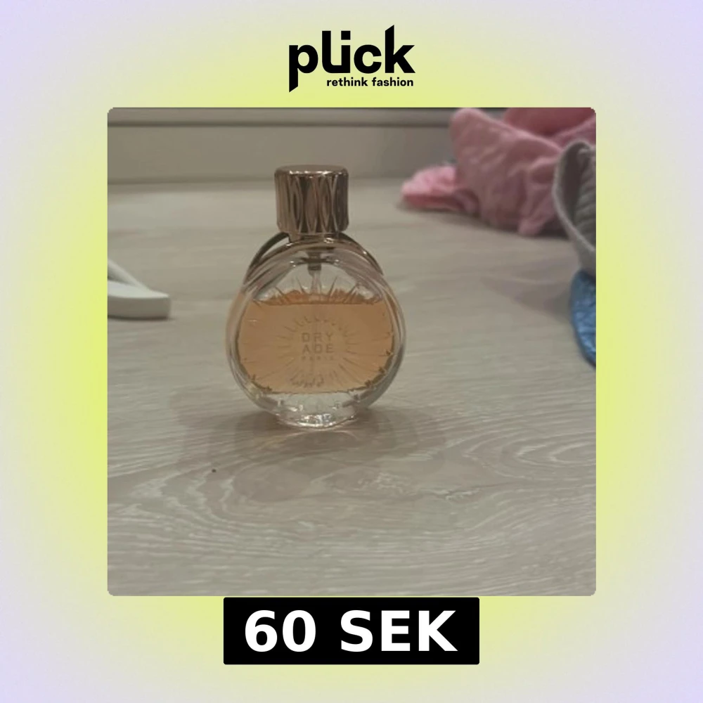 Elegant parfymflaska från Dryade med en rund form och en vacker, solinspirerad design på framsidan. Flaskan har en ljusrosa nyans och ett dekorativt lock i guldton. Perfekt för den som söker en stilfull doftupplevelse.