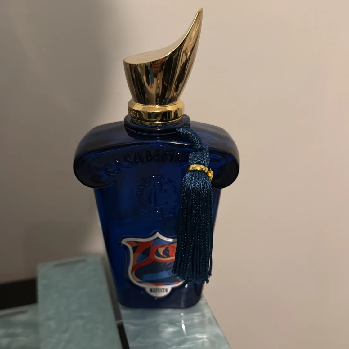 Lyxig parfym från Casamorati i en djupblå glasflaska med elegant guldigt lock och en blå tofs. Flaskan har en unik form och detaljerad etikett framtill. Perfekt för dig som gillar exklusiva dofter och snygg design på parfymhyllan. 95/100ml.