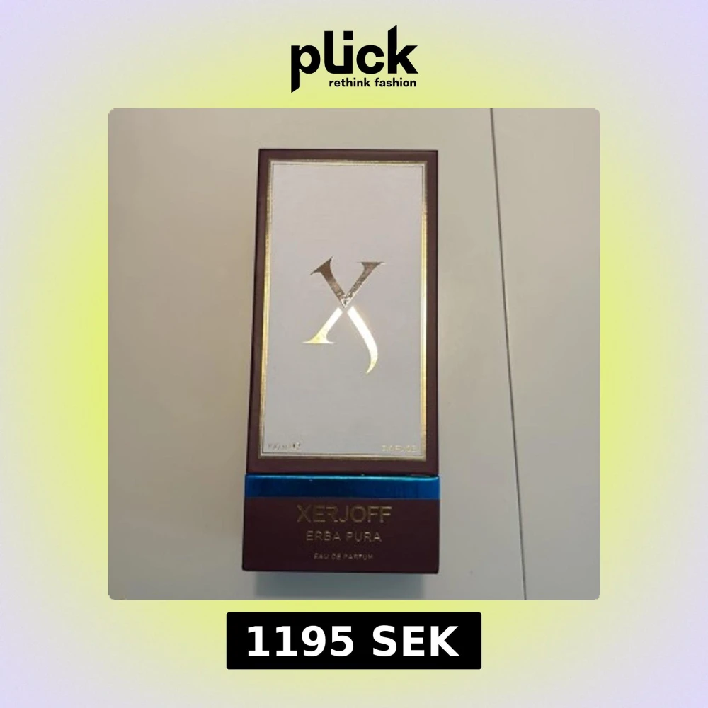 Lyxig parfym från Xerjoff, Erba Pura, i en elegant lila och vit kartong med gulddetaljer och blått band. Eau de Parfum, 100 ml, tillverkad i Italien. Doften är känd för sina fruktiga och fräscha noter och exklusiv känsla. Den är endast använd av ett sprut.