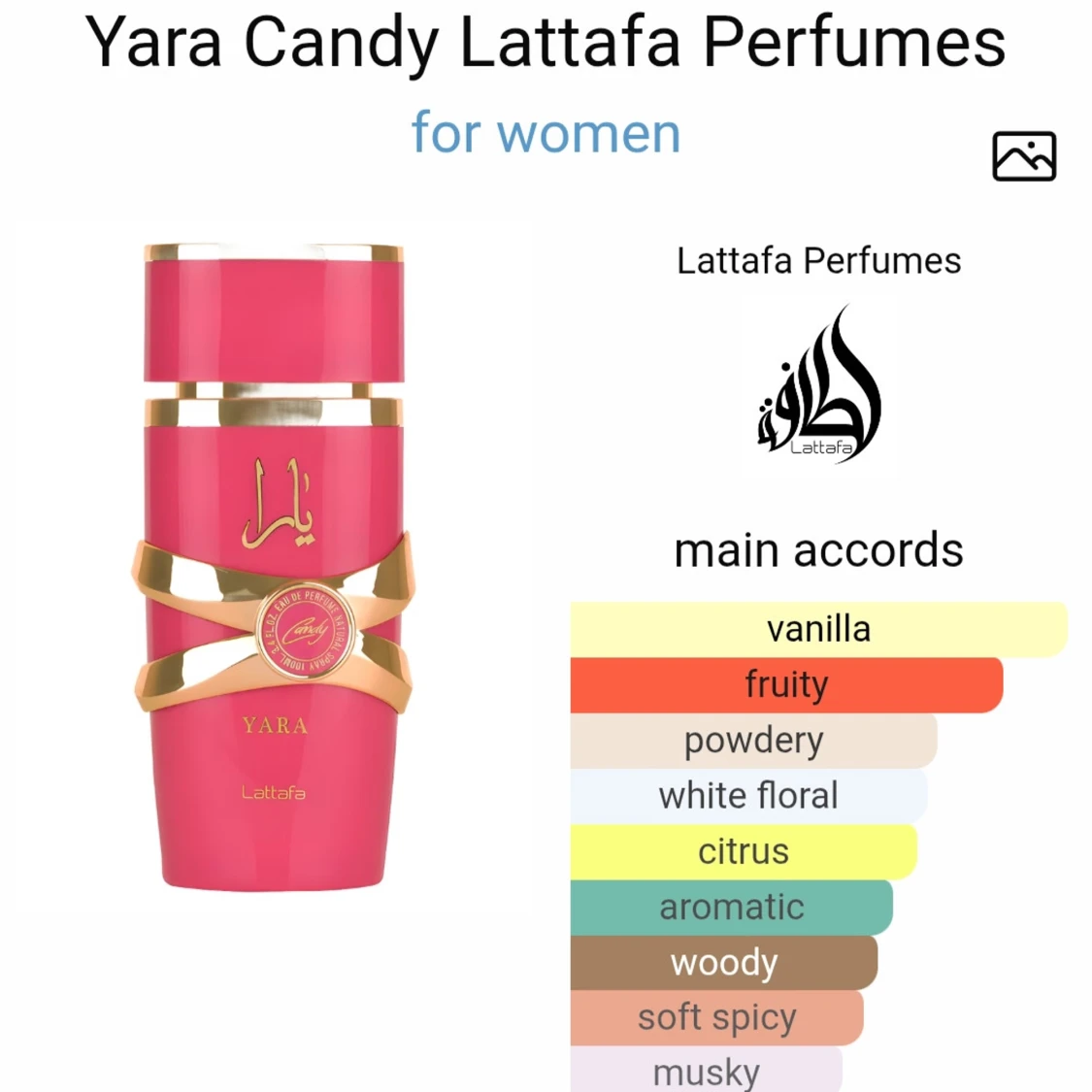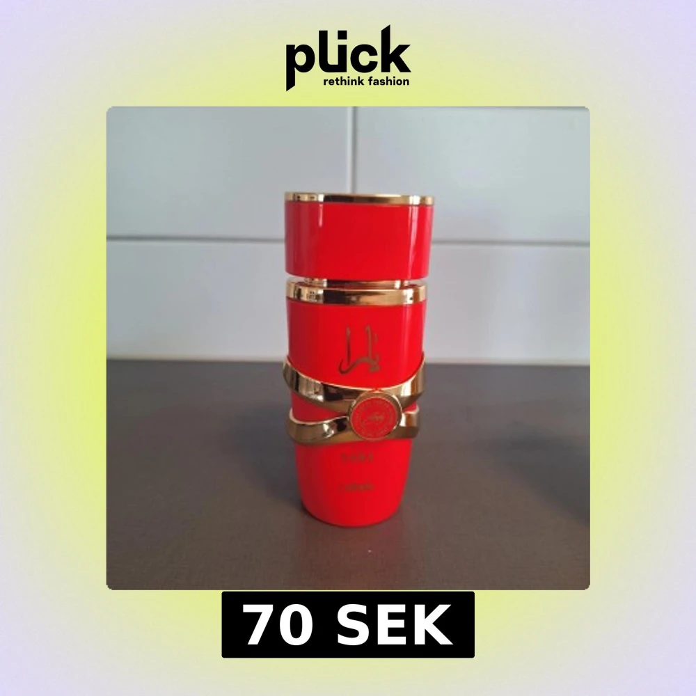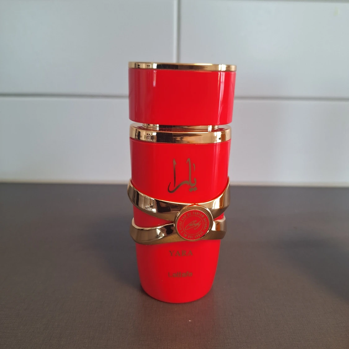 Yara Candy från Lattafa är en parfym i en snygg röd flaska med guldiga detaljer och arabiska tecken. Doften har tydliga inslag av vanilj, frukt, pudriga toner, vit blomma och citrus. Flaskan är tillverkad i plast med metalliska accenter och har en modern, unik form. Ca 70 ml kvar