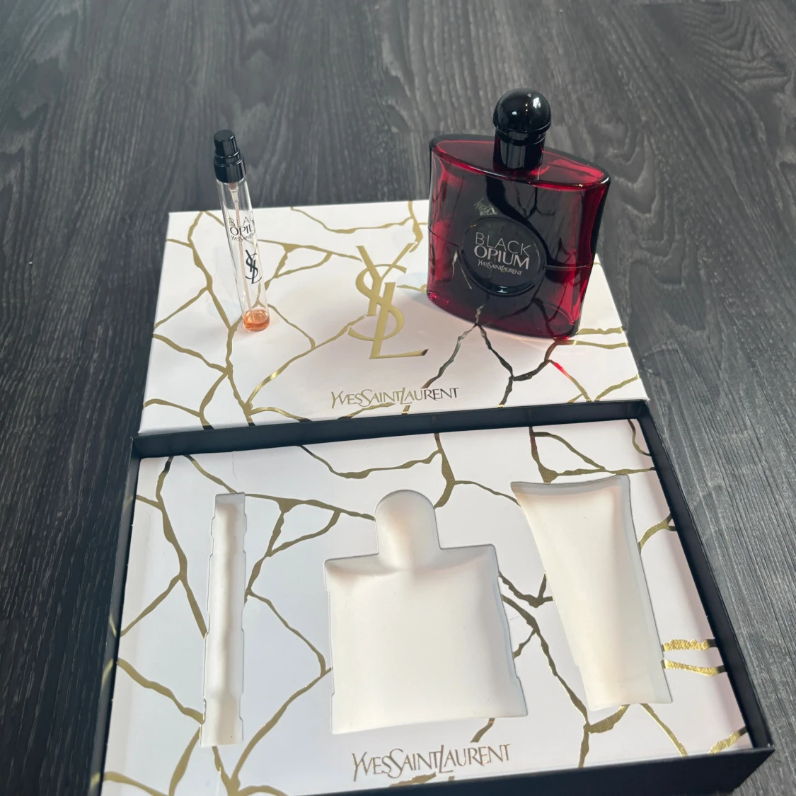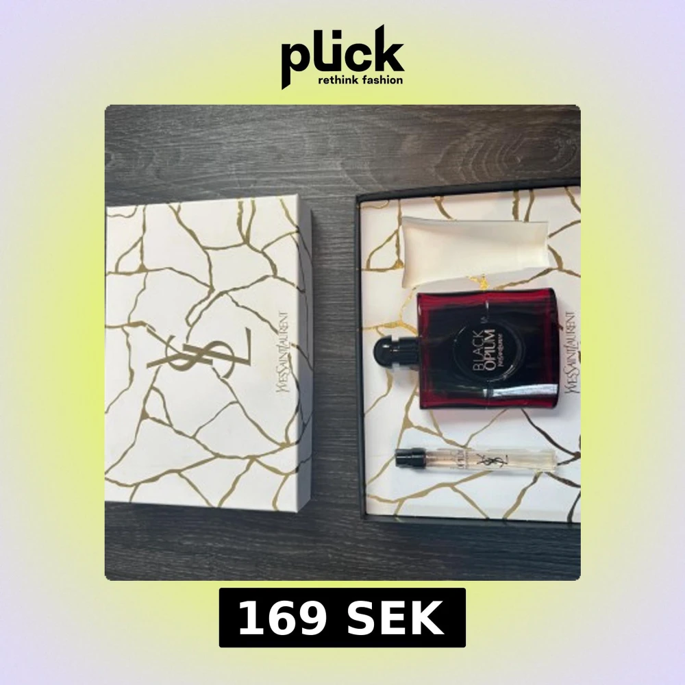 Snygg presentbox från YSL med Black Opium parfym och miniflaska. Flaskorna är tomma!! Bara för dekoration