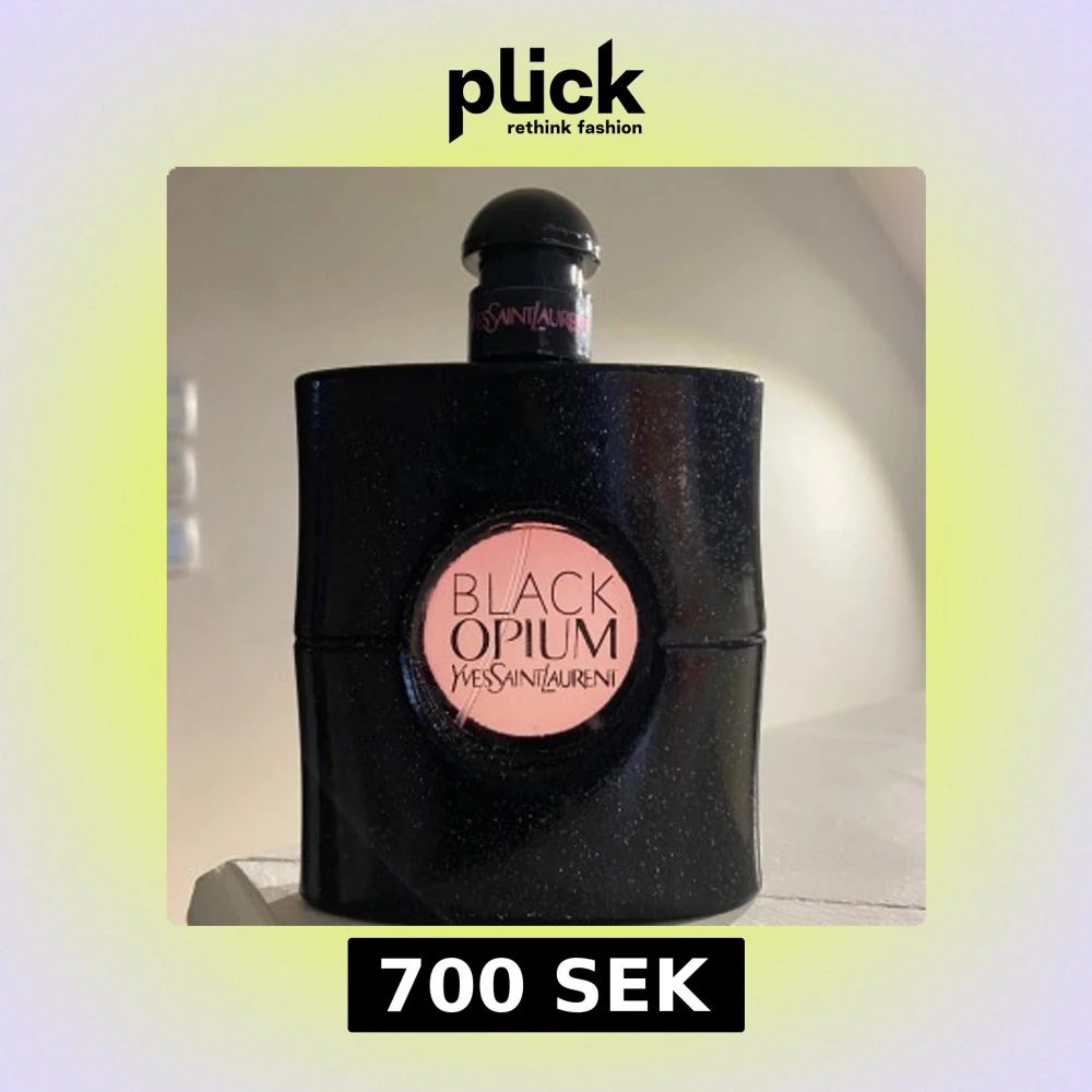 Säljer en flaska Black Opium från Yves Saint Laurent. Flaskan är svart med glittrande yta och har en rund öppning som visar den rosa parfymen inuti. Den har en elegant och modern design med ett svart lock.