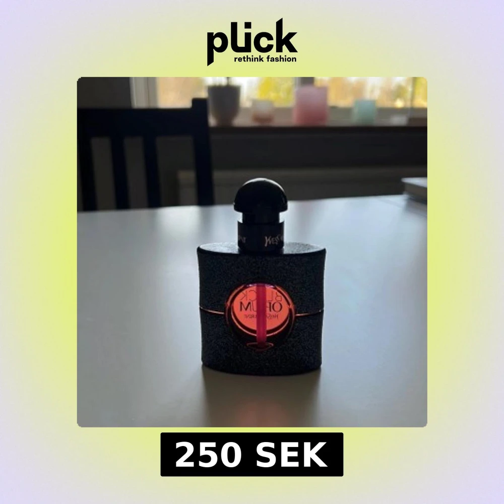 En ikonisk parfymflaska från Yves Saint Laurent, Black Opium. Flaskan är svart med glittrig yta och har ett runt fönster i mitten som visar den rosa vätskan inuti. Korken är svart och rund. Perfekt för dig som gillar lyxiga och moderna dofter.