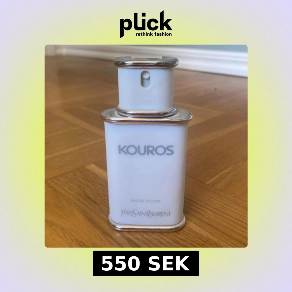 Kouros Eau de Toilette från Yves Saint Laurent i en stilren vit flaska med silverdetaljer. Flaskan rymmer 50 ml och har en modern, maskulin design. Perfekt för dig som gillar klassiska och ikoniska dofter med lyxig känsla. (Är nästan full)