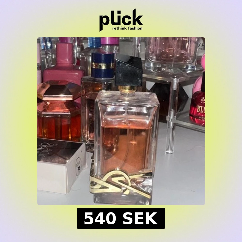 Elegant parfymflaska från Yves Saint Laurent med en rektangulär form och en stilren svart kork. Flaskan är dekorerad med ett guldigt YSL-emblem och innehåller en ljusrosa doftvätska. Perfekt för den som älskar lyxiga och sofistikerade dofter.