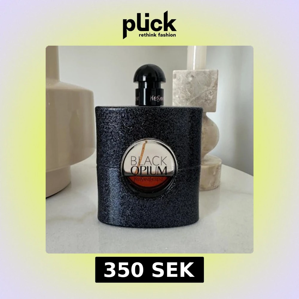 Säljer en ikonisk parfym från Yves Saint Laurent – Black Opium. Flaskan är svart med glittrig yta och rund transparent detalj i mitten där parfymens bärnstensfärgade vätska syns. Rymmer 90 ml och har en elegant svart kork.
