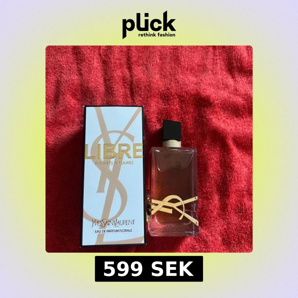 Säljer en lyxig parfym från Yves Saint Laurent, Libre Flowers & Flames Eau de Parfum Florale. Flaskan är rektangulär med guldiga YSL-detaljer och svart kork. Förpackningen är ljus med stora guldiga bokstäver och YSL-logga.