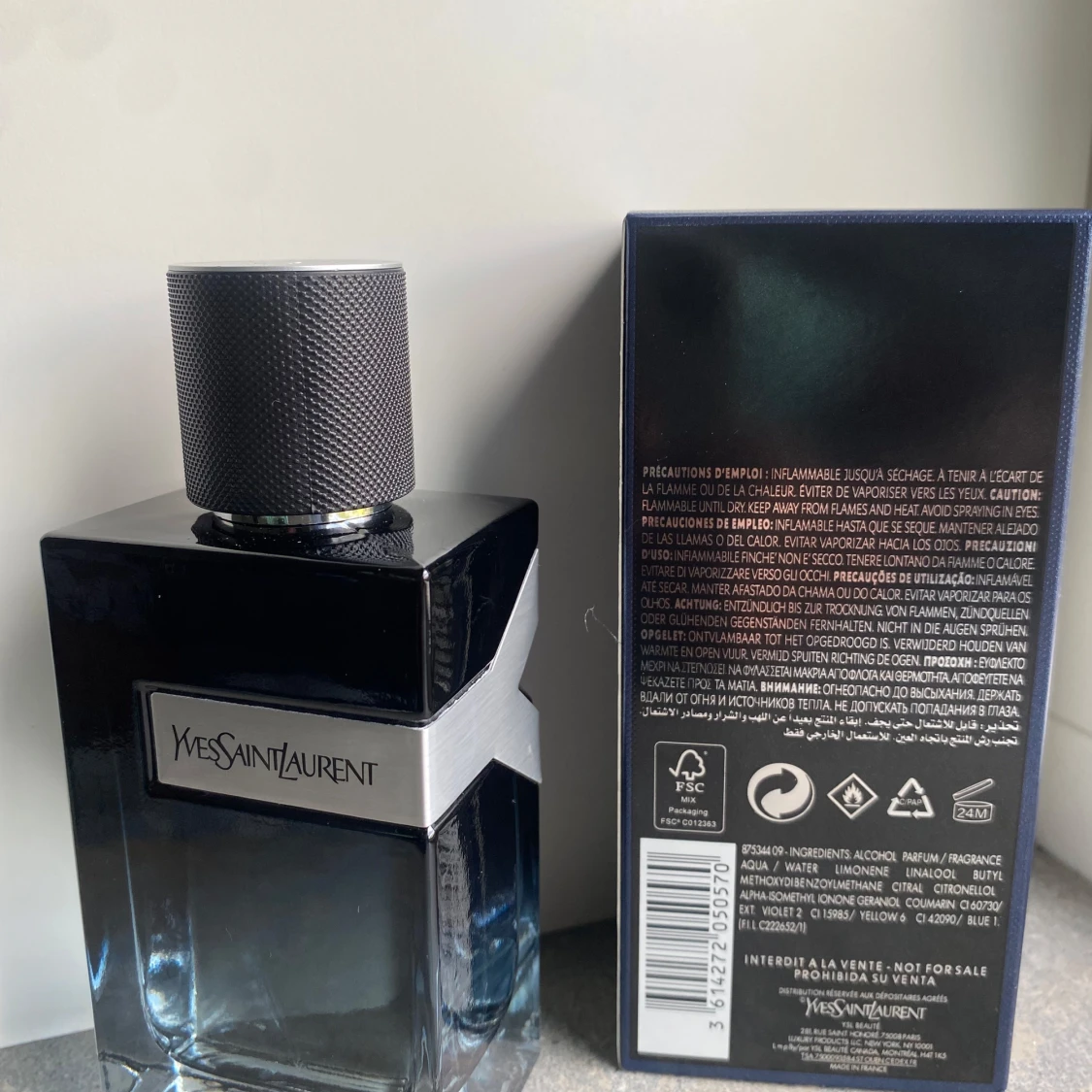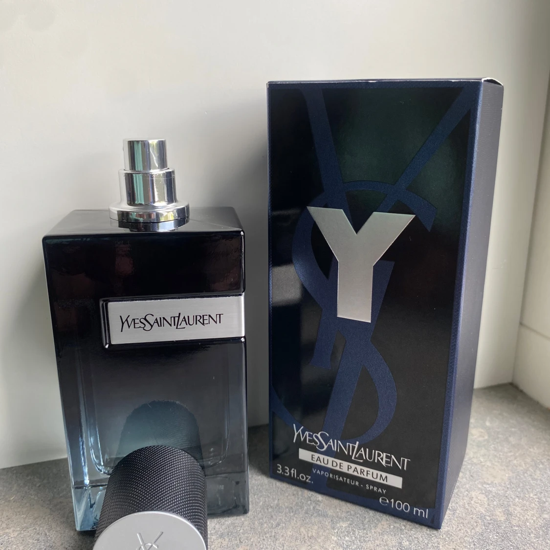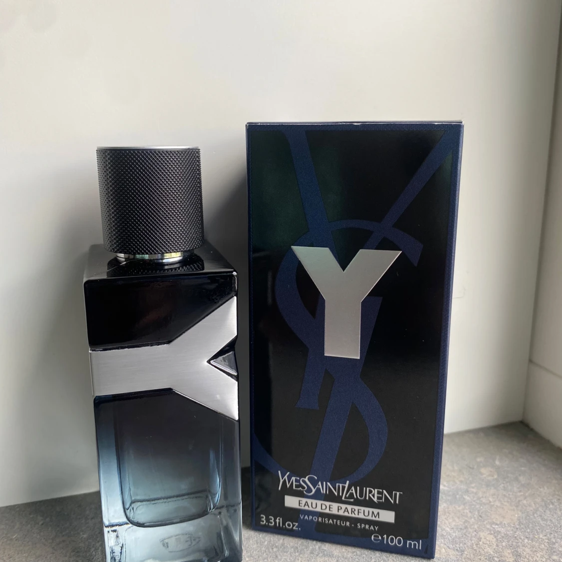 Y Eau de Parfum från Yves Saint Laurent i en stilren, mörkblå glasflaska med silverdetaljer och svart texturerad kork. Flaskan rymmer 100 ml och har en modern, maskulin design med tydlig Y-logga. Kommer i originalkartong med matchande blå och silverfärger.