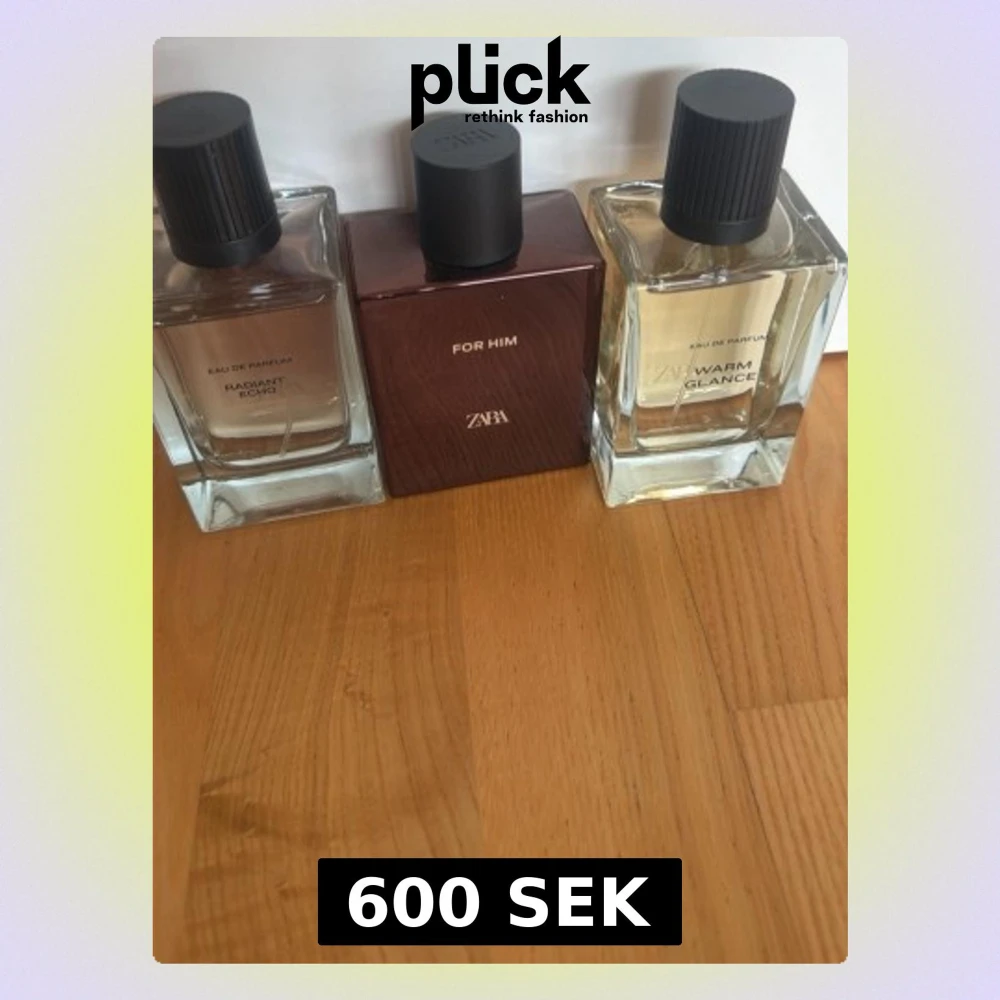 Säljer ett set med tre parfymer från ZARA: Radiant Echo, For Him och Warm Glance. Flaskorna är rektangulära i glas med svarta lock, där For Him har en mörkbrun flaska och de andra två är genomskinliga. Snygg design som passar perfekt i badrumshyllan.