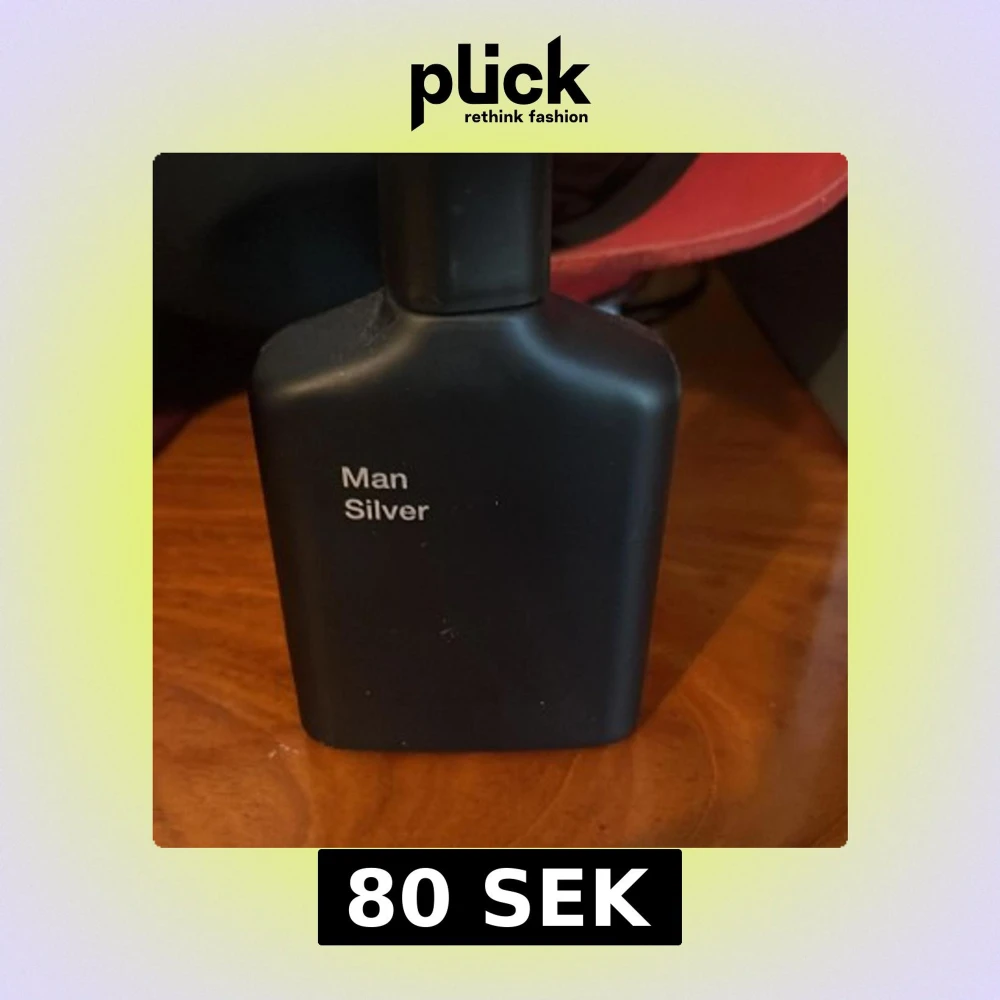 Minimalistisk parfym med stilren design från Zara. Flaskan är svart och har texten 'Man Silver'. Perfekt för dig som vill ha en modern och enkel look på parfymhyllan.