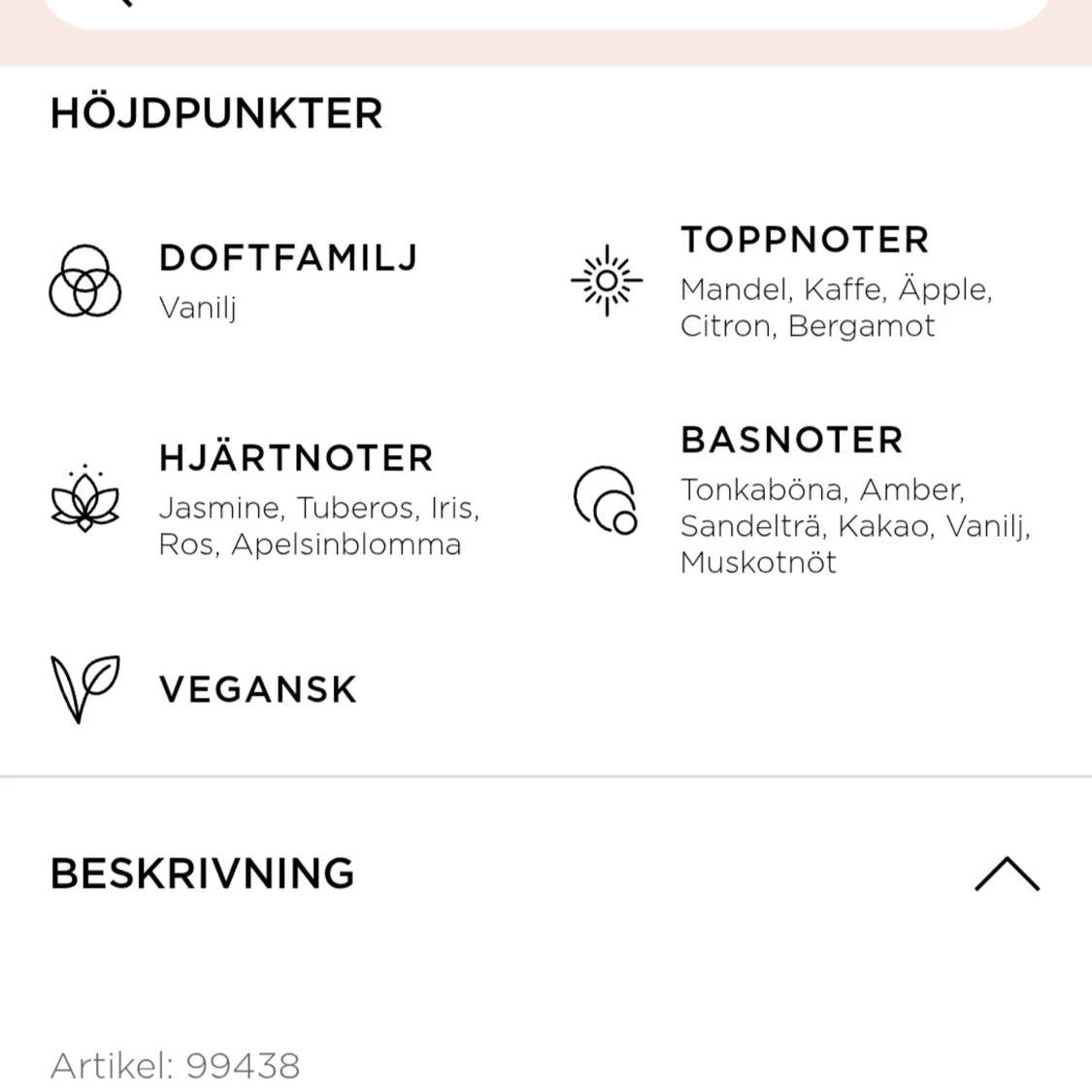 ZOE Eau de Parfum är vegansk och tillhör vaniljdoftfamiljen. Toppnoter: mandel, kaffe, äpple, citron, bergamot. Hjärtnoter: jasmin, tuberos, iris, ros, apelsinblomma. Basnoter: tonkaböna, amber, sandelträ, kakao, vanilj, muskotnöt. Perfekt för dig som vill sticka ut.