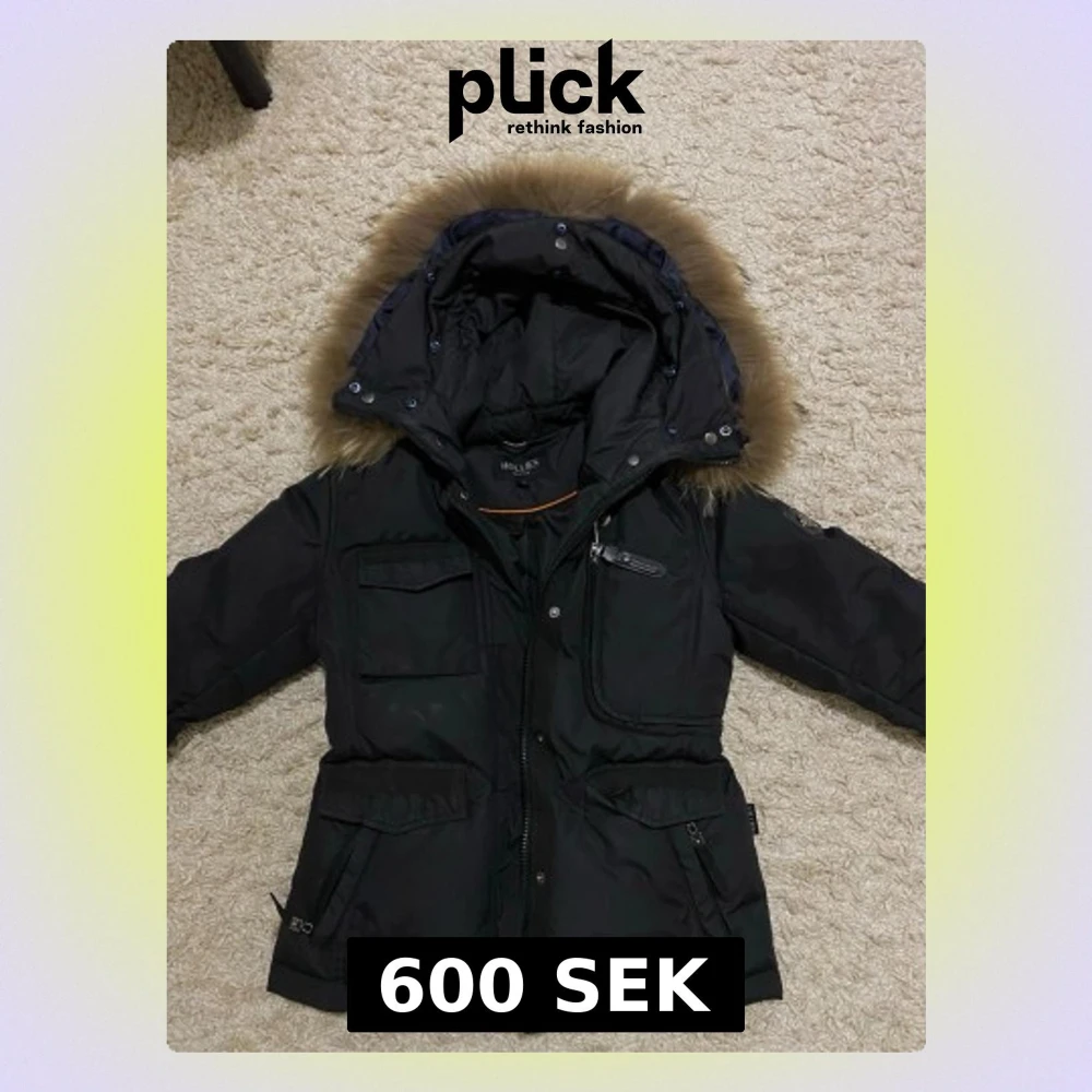 Snygg svart parkasjacka från Hollies med avtagbar huva och äkta päls. Jackan har flera praktiska fickor med dragkedja och tryckknappar, samt en patch med metallogo på ärmen. Perfekt för kalla dagar och riktigt varm.