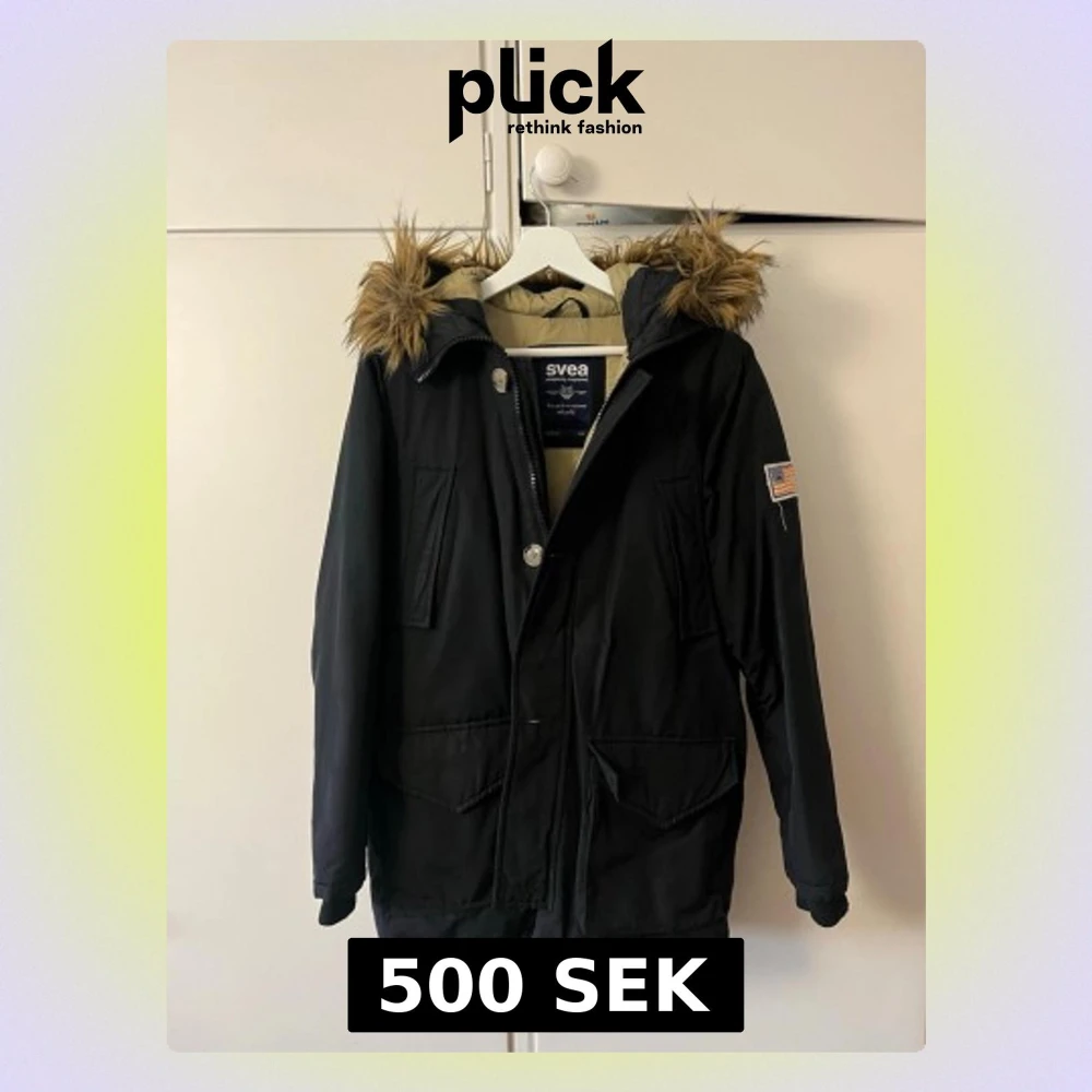 Snygg svart parkas från Svea med luva kantad av brun fuskpäls. Jackan har stora fickor framtill, dragkedja och knappar samt en patch med amerikansk soppa på ärmen. Perfekt för kalla dagar och riktigt stilren design.
