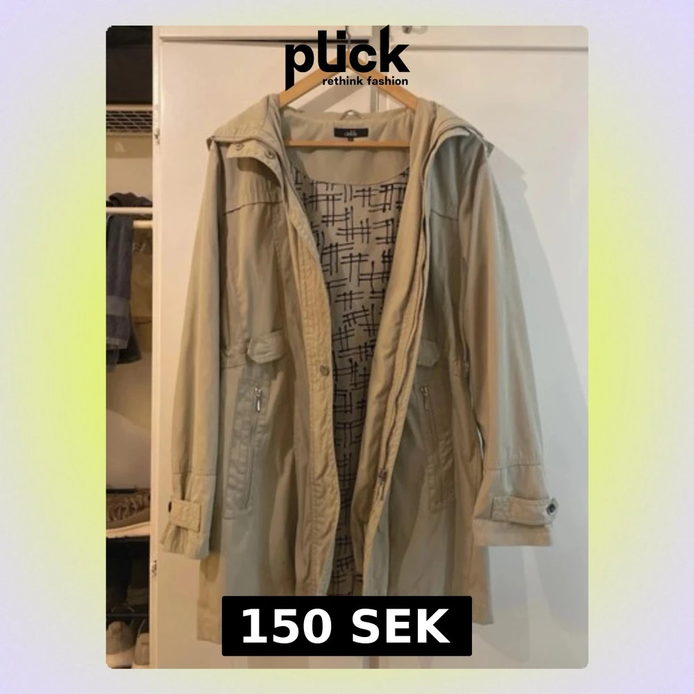 Stilren beige parkasjacka från Isolde med justerbar midja, dragkedja och knappar framtill. Jackan har två fickor med dragkedja, dekorativa knappar vid ärmslut och en praktisk huva. Fodret har ett grafiskt svartvitt mönster som ger extra karaktär. Använd några gånger och är i bra skick. Som ses på sista bilden har ena huvknappen gått loss.