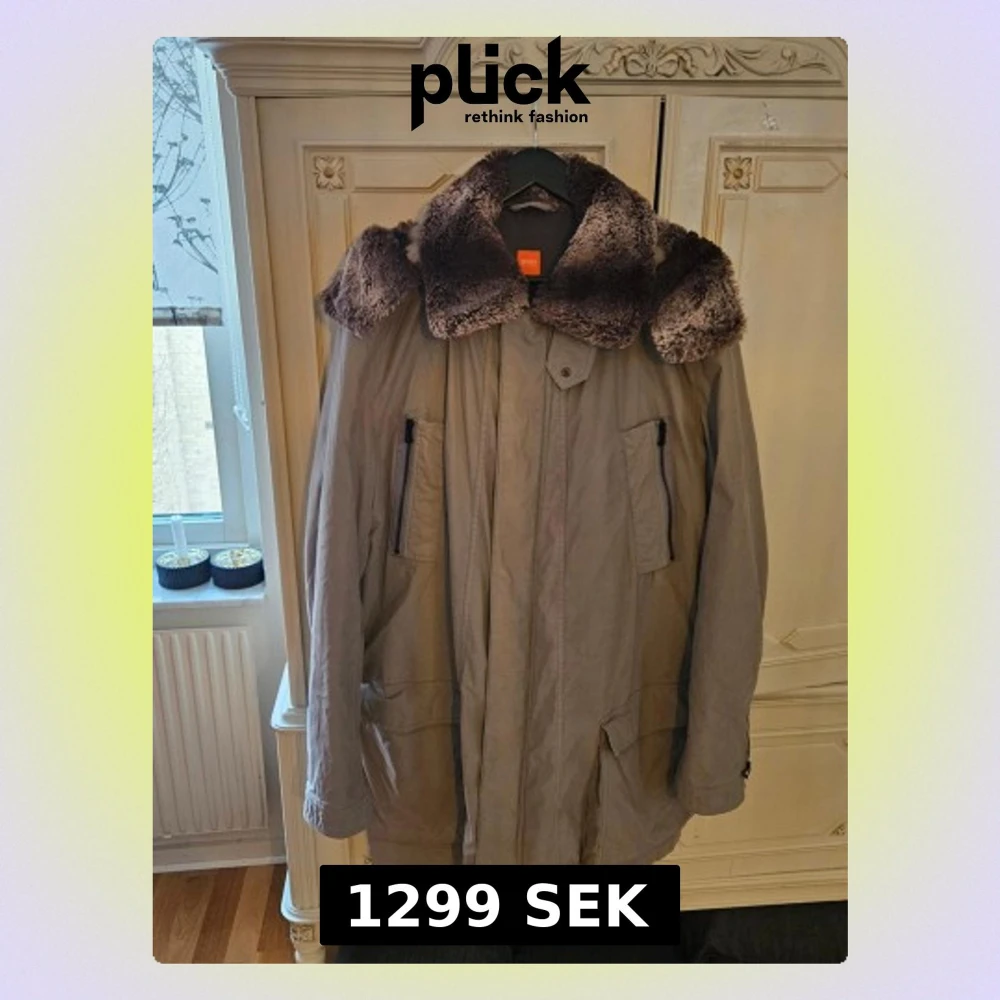 Stilren beige parkas från Hugo Boss Orange med stor avtagbar huva. Och bred krage i mörkbrun fuskpäls. Jackan har flera praktiska fickor med dragkedja och knappstängning framtill. Perfekt för kalla dagar och ger en cool, avslappnad look. Jackan kan även bli en vårjacka då innefodret är avtagbart som luvan.