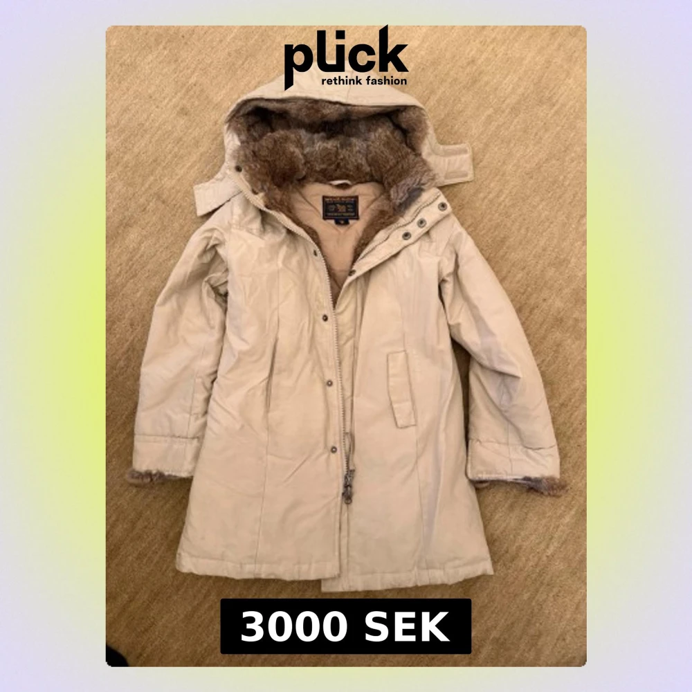 Snygg beige parkas från Woolrich med avtagbar huva och mjukt fuskpälsfoder. Jackan har dragkedja och knappar framtill, två fickor och pälsdetaljer vid ärmslut och huva. Perfekt för kalla dagar och sopren design.