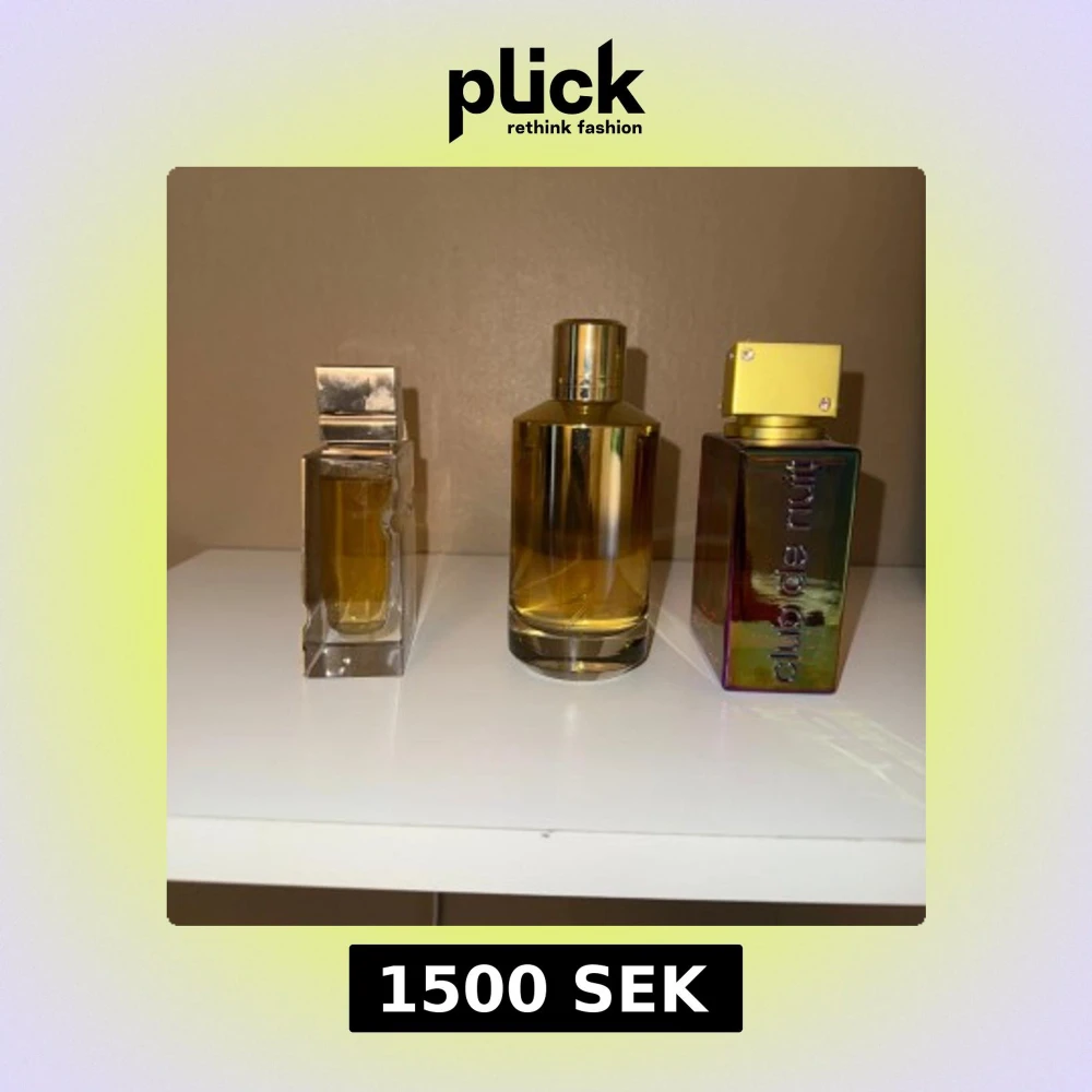 Säljer tre exklusiva parfymer: Al Haramain Amber Oud i guldig fyrkantig flaska, Mancera Instant Crush i rund gyllene flaska och Armaf Club de Nuit Untold i regnbågsskimrande fyrkantig flaska med guldfärgat lock och kedja. Alla flaskor har unika och stilrena designer.