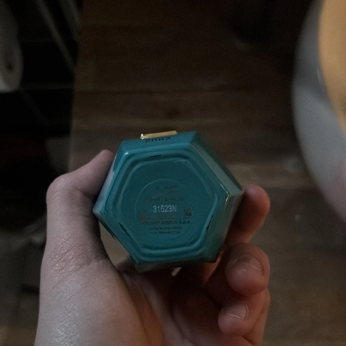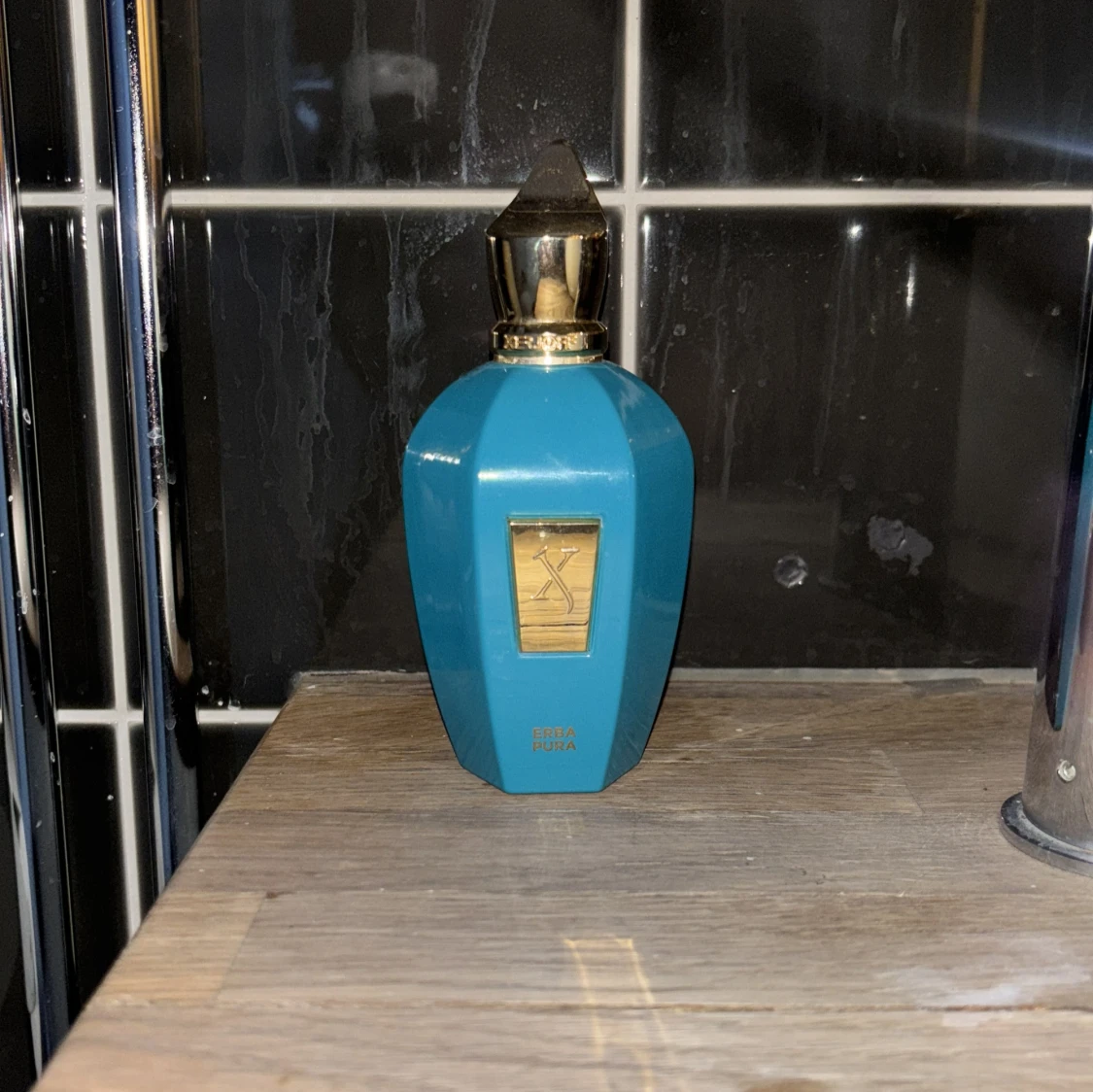 Elegant xjeroff parfymflaska med en unik geometrisk form och ett lyxigt guldlock. Flaskan har en gyllene etikett på framsidan som ger en exklusiv känsla. Perfekt för den som vill ha en stilfull och iögonfallande parfymflaska på hyllan.