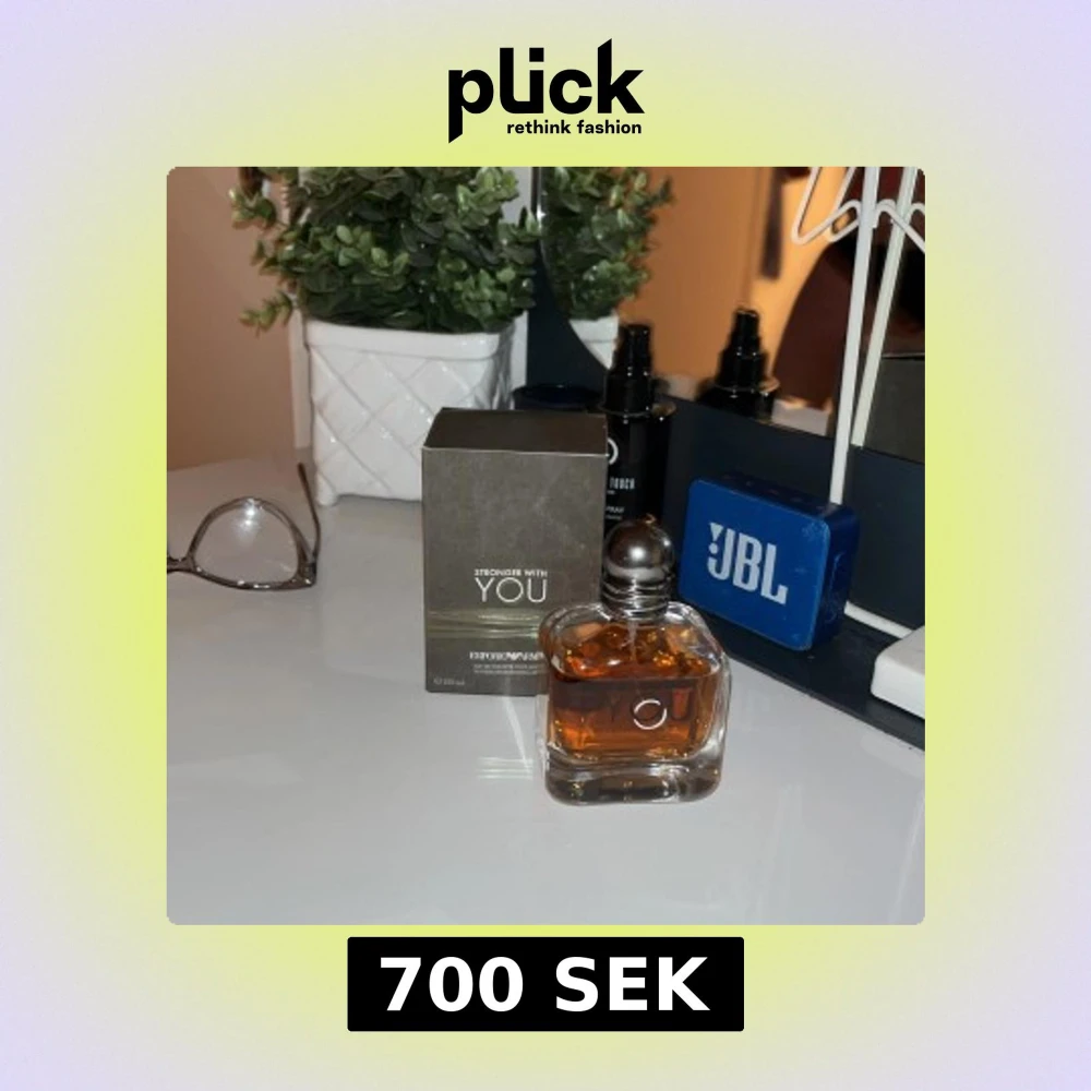 Säljer en flaska Stronger With You Eau de Toilette från Emporio Armani. Flaskan är elegant med en rundad fyrkantig form och en metallisk kork. Doften är varm och kryddig, perfekt för den självsäkra mannen. Innehåller 100 ml.